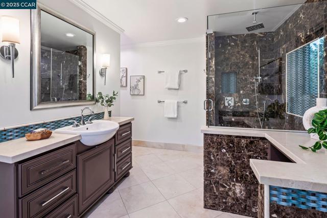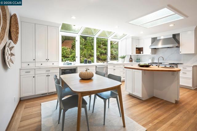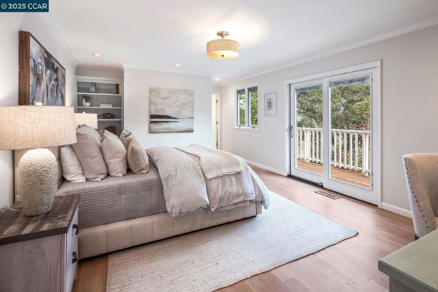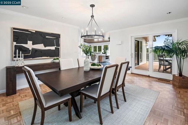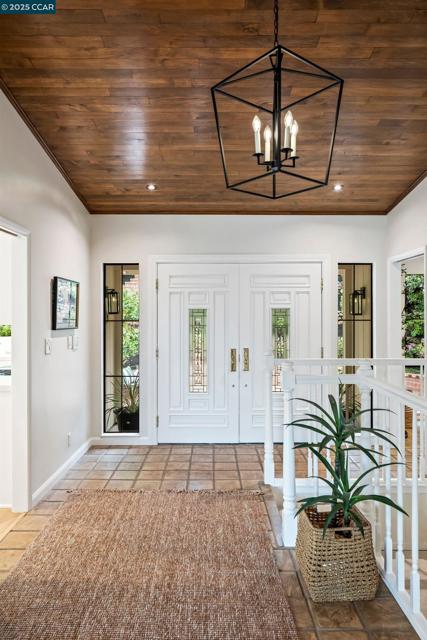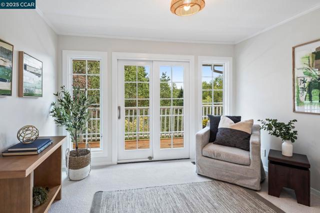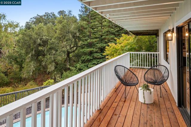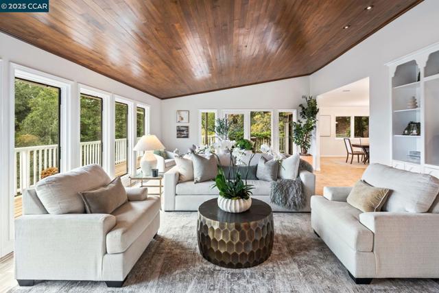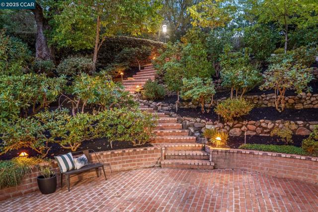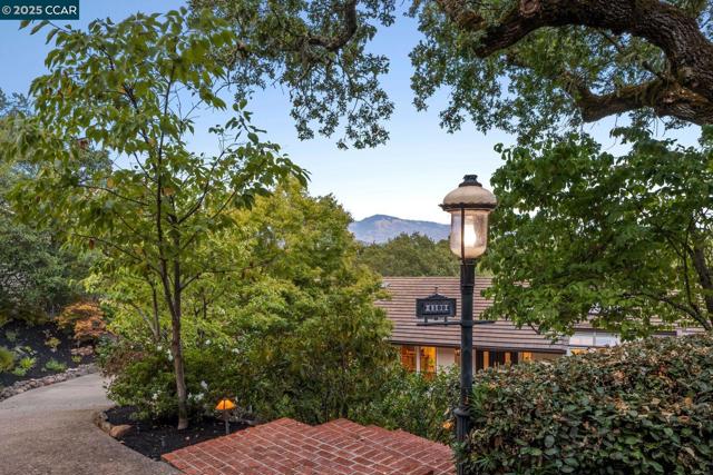 This home sits on a private cul-de-sac amidst nature. A brick stairway meanders down through the immaculate garden to the home’s spacious foyer. It leads to the 300-sq-ft living room, with a paneled ceiling above, parquet hardwoods below, wood-burning fireplace and deck access. Move for dinner to the spacious dining room, with views on 3 sides. The well-appointed kitchen sits alongside, with elite appliances, granite counters, extraordinary garden views through oversized windows, a skylight and oak hardwoods. The principal suite and another large bedroom also are on the main floor, each with an en-suite bath. Both have ample closets; the principal suite has 2. The other bedrooms are downstairs, along with a 450-sq-ft family/rec room (with fireplace). That room leads outside to a deck and down to the swimming pool (resurfaced in 2020), and the adjacent bathroom and outdoor shower. Work or study in the spacious office on the main floor, with deck access and views of surrounding trees. Parking is easy in the 3-car garage and on the cul-de-sac above. For safety, the home’s roof was replaced in 2012 with Eaglelite Ponderosa concrete tiles, and the fully equipped fire station is just down the hill. So, too, are Lafayette’s restaurants and shopping, just minutes away.