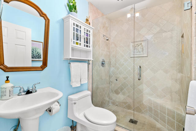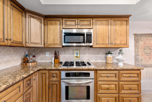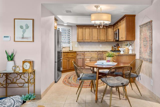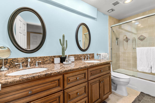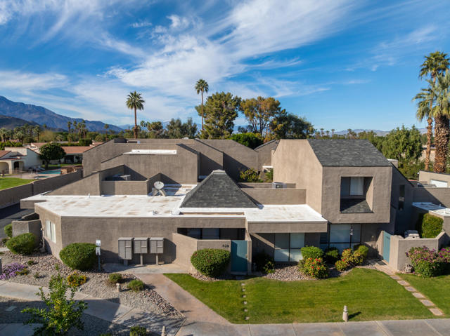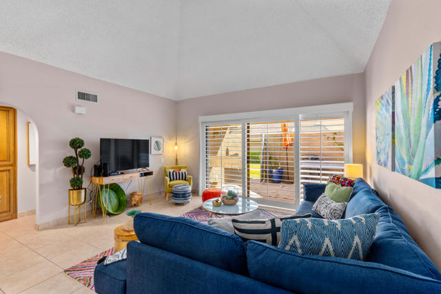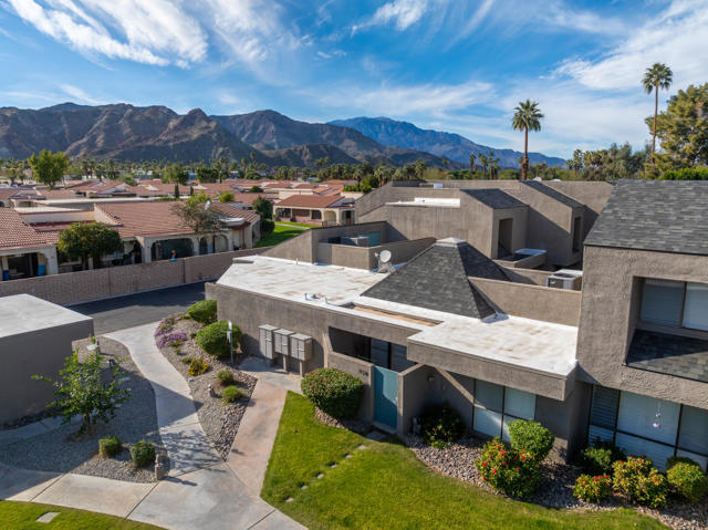 Beautifully updated 2bd & 2bath turnkey condo located in Desert Village in the heart of Rancho Mirage. Walking distance to The River, outdoor mall, and the Omni Rancho Las Palmas Resort & Spa. As you enter the home and walk into the room your eyes are drawn to the vaulted ceiling with a pretty piece of stained glass. The open floorplan creates a comfortable space that offers designer curated furnishings and planation shutters. The kitchen comes equipped with custom cabinetry and stainless steel appliances. The primary bedroom has an ensuite bath that has a double vanity and custom tiled shower. The guest bedroom is steps away from the adjacent full guest bath. It also has exclusive access to an outdoor patio area. The private patio off of the living area has mountain views and is the perfect spot to relax and enjoy the beautiful desert weather. The community features 3 pools, 2 spas, clubhouse, tennis court, all just a short walk from your home. Start enjoying your desert lifestyle today!
