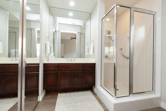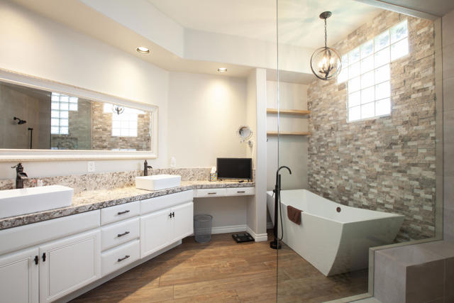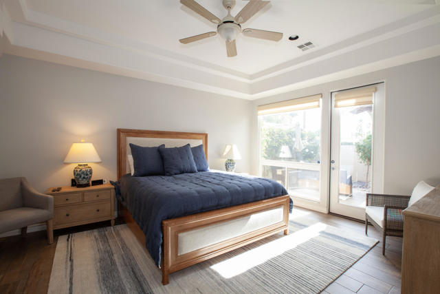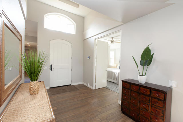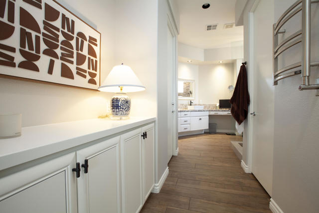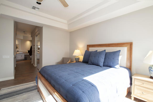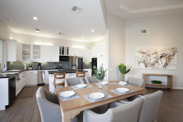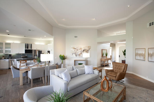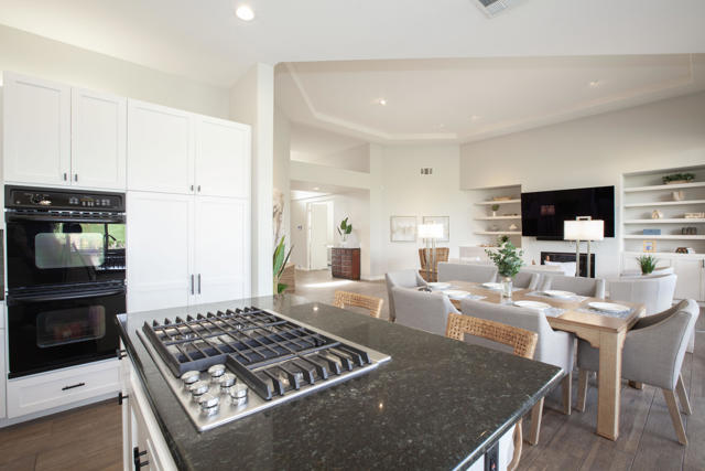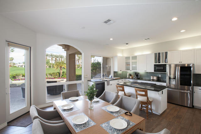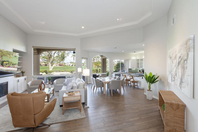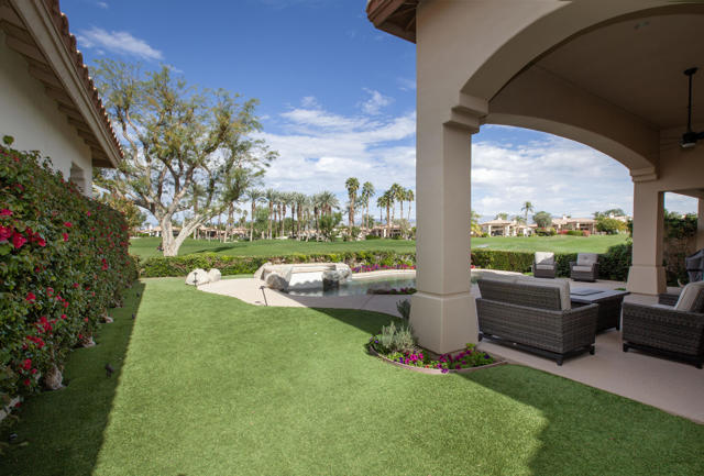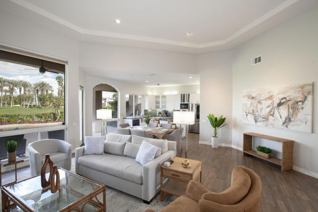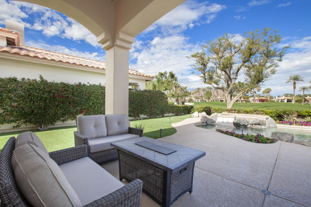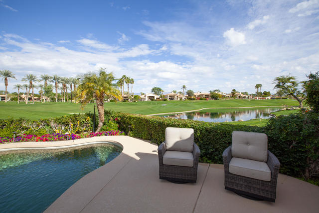 Set within the prestigious gates of Rancho La Quinta Country Club, this beautifully remodeled desert retreat truly has it all--an exceptional large lot, breathtaking mountain backdrop, and sweeping fairway and lake views that define luxury living in the Coachella Valley. Perched above the 16th fairway of the Robert Trent Jones Jr. Championship Golf Course, the elevated setting delivers dramatic sightlines, added privacy, and unforgettable sunsets that glow across the Santa Rosa Mountains. Designed for effortless indoor-outdoor living, the expansive entertainer's patio is the heart of the home--perfect for hosting friends or relaxing in complete serenity. Take in the panoramic scenery from the large custom pool with an elevated spa and waterfall, fire up the BBQ, and enjoy the resort-style lifestyle Rancho La Quinta is known for.Inside, the desirable great room floor plan impresses with tall ceilings and walls of view windows that bring the outdoors in. Italian porcelain plank-style flooring runs throughout, complemented by upgraded baseboards and a clean, modern aesthetic. The living area is anchored by a sleek wall-mounted TV framed by custom built-in accessory shelving, complete with subwoofer and sound bar for the ultimate movie-night experience. The remodeled kitchen is both stylish and functional, featuring white-finished cabinetry, a large center island with gas cooktop, glass subway tile backsplash, and a striking mix of stainless steel and black appliances--ideal for casual mornings or entertaining with ease. The spacious primary suite is a private sanctuary with its own patio and a beautifully remodeled bath offering a walk-in shower and elegant freestanding tub--your personal spa escape after a day on the course. This home is filled with meaningful upgrades, including nearly $37,000 in new Tommy Bahama furnishings, California Closets, a Water Cop system leak detection system, and newer air conditioners--including the garage unit. The two-car garage is finished with Swiss Trax flooring, built-in storage, and a newer hot water heater, plus there's a golf cart garage for ultimate country club convenience. Offered furnished per Inventory List, with additional enhancements detailed in the Improvements List--this is Rancho La Quinta C.C. living at its finest.