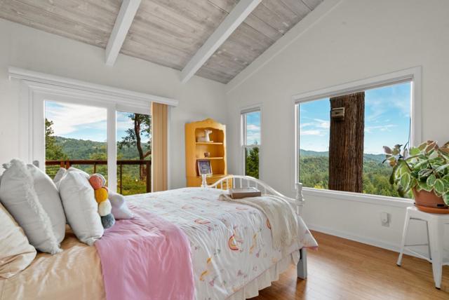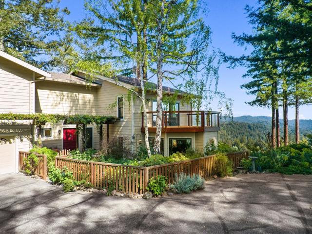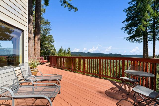 Perched above the treetops with breathtaking 40-mile views, this remarkable retreat is designed to live in harmony with its natural surroundings and has been meticulously maintained with exceptional attention to detail. Expansive picture windows invite in abundant light and frame sweeping redwood and ridgeline vistas, creating a peaceful, sanctuary-like feel throughout the home. The kitchen is warm and inviting, featuring granite countertops, custom cabinetry, and high-end appliances, and flows seamlessly into an intimate dining area surrounded by panoramic views. The spa-inspired primary bathroom offers a serene escape, thoughtfully designed for comfort and relaxation. Outdoor living truly shines here. Enjoy the expansive deck complete with a hot tub, raised garden beds, and a one-of-a-kind bench built around a majestic redwood treean unforgettable place to unwind and take in the beauty of the setting. Lovingly cared for and thoughtfully improved over time, this home offers a rare blend of privacy, comfort, and inspiration. Ideally located for commuters to Silicon Valley or Santa Cruz, and perfectly suited for remote work, this is a place where peace, beauty, and everyday living come together. Once you arrive, you may never want to leave.