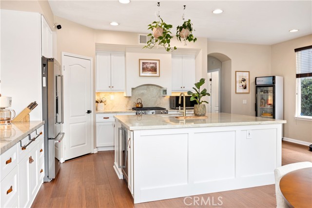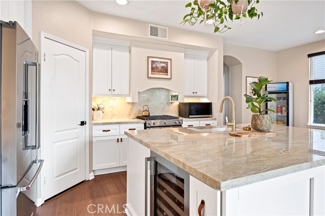 Located on a quiet cul-de-sac in the highly desirable Harveston community, this absolutely stunning 4-bedroom, 2.5-bath home offers over 2,100 sq. ft. of upgraded living space just steps from Harveston Lake. Upon entry, you’re welcomed by a spacious formal living room, perfect for relaxing or entertaining. The main level features new bamboo flooring throughout and a remodeled powder bathroom for added convenience. The fully remodeled kitchen is the heart of the home, showcasing luxurious Taj Mahal quartzite countertops, soft-close cabinetry with custom leather pulls, a massive center island, upgraded GE stainless steel appliances, wine refrigerator, coffee bar, and walk-in pantry. The kitchen opens seamlessly to the family room with a cozy fireplace, creating the ideal space for everyday living and gatherings. Upstairs features all four bedrooms, highlighted by an expansive primary suite with a spacious bathroom complete with dual sinks, a soaking tub, a step-in shower, and a large walk-in closet. Three additional bedrooms provide ample space and storage and share a full hallway bathroom. A convenient upstairs laundry room with sink completes the second level. Step outside to a private backyard with no rear neighbors, offering added privacy, along with a patio slab and lush green lawn—perfect for outdoor entertaining or play. Additional highlights include an extra-long driveway for additional parking, a two-car attached garage, a solar system with battery backup for energy efficiency, and a newer HVAC system replaced in 2021 for peace of mind. Harveston is one of Temecula's most desirable communities, favored by so many for the amenities, olympic sized community pool and splash pad, sports parks, easy commuting, shopping, Ysabel Barnett Elementary and Chaparral High School, and of course the LAKE activities! Close to wine country, Promenade Mall, Old Town Temecula, and the 15 Freeway, come and see why Harveston is at the top of the list for buyers looking for communities to live in Temecula!