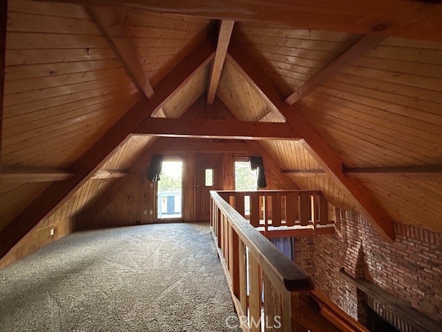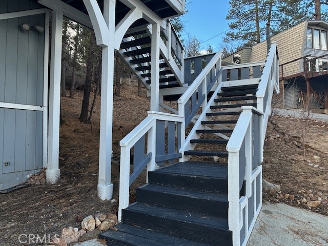 Rustic chalet with views of the mountains and Big Bear Lake. Watch the fireworks from the deck on July 4. Walk to the village for pizza and a movie. Open floor plan takes advantage of natural light and vaulted ceilings. Primary bedroom on first living level has deck access through sliding glass doors. Second and third bedrooms on upper level with loft. Loft has balcony area for lake views at sunrise. Loft makes a great office area with views of the mountains. Washer and dryer hookups in hall closet. Additional storage under the house.