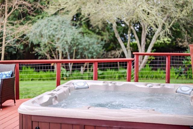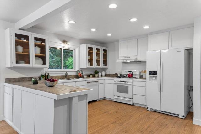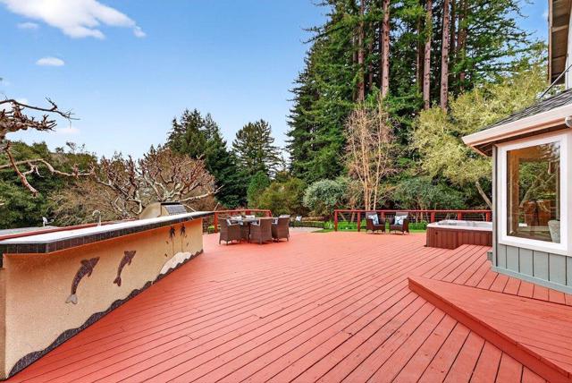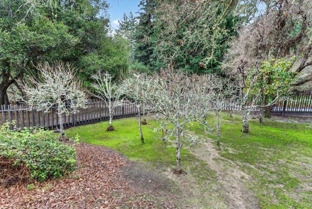 This peaceful mountain home truly feels like a private retreat. Less than 10 minutes to Aptos village and up a shared driveway with only 1 other property, this cozy and charming home rests on a sunny lot with a large fenced yard and plenty of open land for work and play. The expansive ground level deck looks out over manicured lawns, a private orchard with dozens of fruit trees, extra storage sheds, views of redwood groves and lighted patios and pathways that wind throughout the fenced portion of the property. The land beyond the fence is gently sloping with endless possibilities, plenty of space for future garages, barns or other structures. There is plenty of space for parking and oversized vehicles. The outdoor kitchen and deck are perfect for entertaining and backyard barbecues. Take in the night sky while you soak in your private hot tub. The home itself enjoys abundant sunshine coming through the dual pane windows. Inset lighting brightens the home at night while the wood burning stove keeps you warm in the winters. There is new waterproof flooring, fresh carpet and paint, a tankless water heater, long lasting architectural roofing (new in 2018) and a wheel chair friendly access to the ground floor bedroom and bathroom. This wooded oasis and mountain haven is a must see!