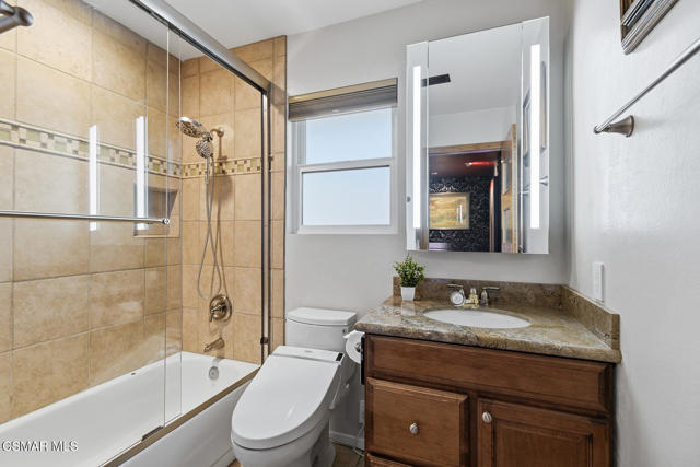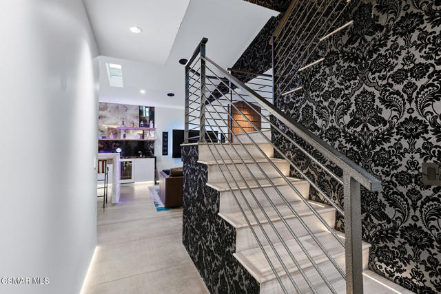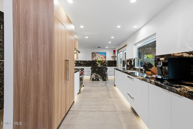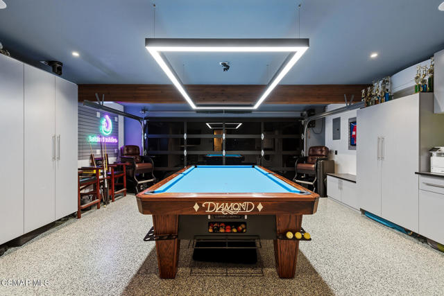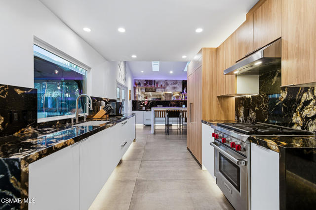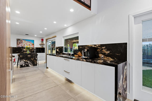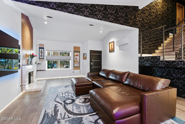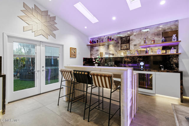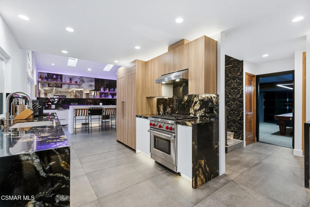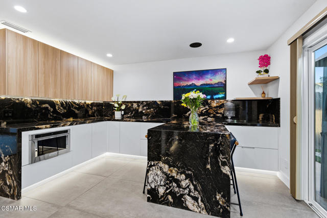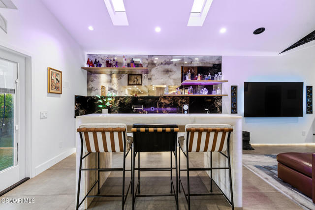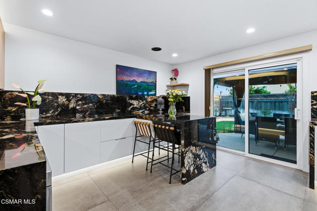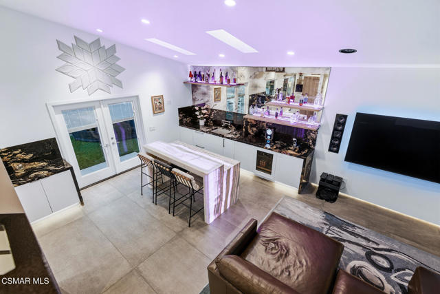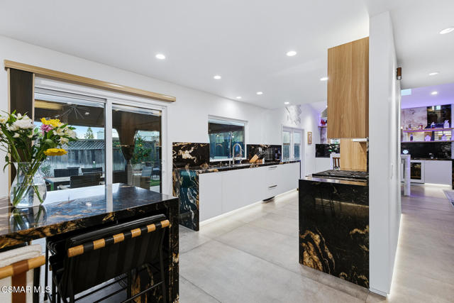 Welcome to a truly one-of-a-kind modern home in the heart of Ventura, where thoughtful design, high-end finishes, and effortless entertaining come together beautifully. Located at 9998 Jamestown, this exceptional residence blends contemporary luxury with everyday comfort in a desirable, established neighborhood. From the sleek smooth-stucco exterior and metal roof to the landscaped front yard with synthetic turf, low-voltage lighting, and a serene Buddha water feature, every detail has been carefully curated to create a striking first impression. Inside, the open great room impresses with large-format concrete tile floors, skylights that flood the space with natural light, base lighting, a dramatic custom onyx fireplace, and a built-in Dolby Atmos sound system. French doors with built-in shades and blackout blinds create a seamless indoor-outdoor flow and a comfortable, modern ambiance. The gourmet kitchen is both stylish and functional, featuring custom two-tone cabinetry, a Wolf range, built-in JennAir refrigerator, Fisher & Paykel drawer dishwasher, microwave drawer, and striking Golden Spectrolite granite countertops with waterfall edges. An extended dining area with wraparound cabinetry and built-in storage adds to the home's effortless entertaining appeal. A custom bar elevates the space even further, offering a Sub-Zero mini fridge, Viking ice maker, onyx bar top, and ambient accent lighting, perfect for hosting or unwinding at the end of the day. The primary suite is a private retreat with real wood floors, a smoked mirror feature wall, and a spa-inspired bathroom complete with marble countertops, a Toto toilet, zero-threshold drains, custom glass enclosures, and a luxurious steam shower.Step outside to a backyard designed for memorable gatherings, featuring synthetic turf, citrus trees, low-voltage lighting, and a pergola with curtains and soft lighting for relaxed evenings under the stars. The garage is a true bonus space with showroom-style epoxy floors, custom cabinetry, a mini-split system, built-in speakers, a washer and dryer, and premium lighting, ideal for a home gym, studio, or ultimate hangout zone. With smart features, upgraded electrical, a tankless water heater, soft-water system, Milgard windows and doors, and a glass garage door, this exceptional home at 9998 Jamestown, Ventura, CA delivers modern luxury, comfort, and turnkey living at its finest.