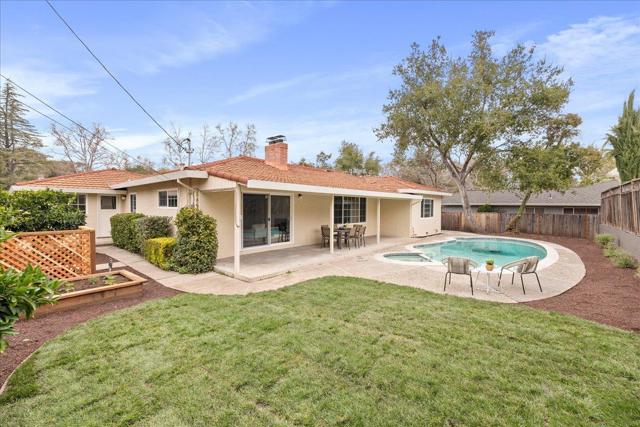 Ideally located in the highly coveted Golden Triangle area of Saratoga, this beautifully maintained single-story home with approx 1,974 square feet offers 3-bedrooms and 2 1/2 bathrooms. The gorgeous eat-in kitchen is a chef's delight, featuring quartz countertops, stainless steel appliances, and new cabinetry. The home boasts separate family and living rooms, each with a cozy wood-burning fireplace. This ideal floor plan offers a wonderful flow, with the bedrooms, including the spacious primary suite, located on one end of the home. On the opposite end of the home just past the kitchen is a large laundry/utility room with a pantry and the convenient 1/2 bath. Situated on a generous approx 10,200 square foot lot, the private rear yard is highlighted by a covered patio, sparkling pool, and mature fruit trees. Other amenities include a large detached 2-car garage accessed by a covered breezeway, central heating and A/C, and award-winning Saratoga Schools. Don't miss the opportunity to make this Saratoga gem your own!