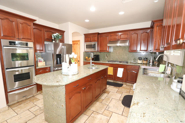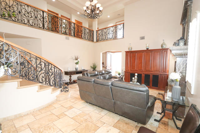 Builder's pride, jumbo sized home (3,753 square feet) featuring 6 bedrooms and 5 bathrooms 3 fireplaces, with well over a million dollars invested in this estate. Beautiful stone work throughout including Travertine flooring, gourmet kitchen with granite counters, 2 story home with 2 balconies, 2 fireplaces, spacious pool and stacked stone spa, covered patio, and solar system. Tons of detail and upgrades in this one. Situated in a desirable area of Cathedral City. Panoramic mountain views, and one of the nicest homes you'll see in Cathedral City. No HOA dues. Furniture negotiable.