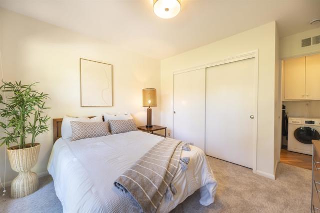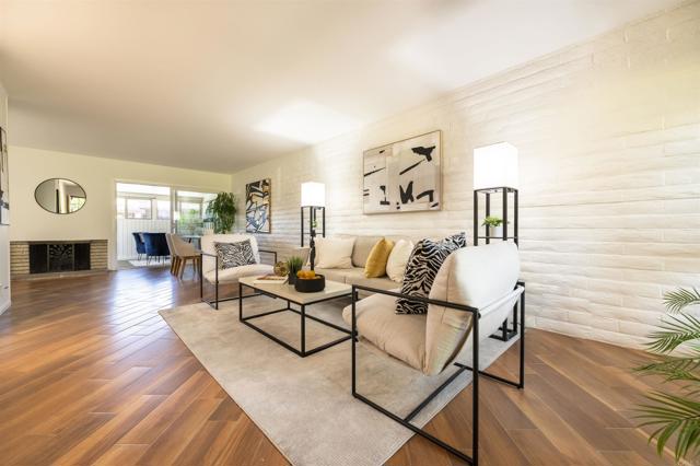 Welcome to this beautifully updated, single-level end-unit condo in Grossmont Village. Set within a serene, park-like setting with meandering walking paths, mature landscaping, a sparkling swimming pool, and a welcoming clubhouse, this special residence offers the perfect blend of comfort, convenience, and lifestyle. Single-level living is a rare find in San Diego, and this thoughtfully upgraded home truly stands out. As an end unit, it enjoys added privacy and abundant natural light, enhanced by skylights that brighten the interior spaces. The inviting living room features a charming wood-burning fireplace, creating a warm and comfortable focal point for relaxing or entertaining. The interior has been freshly painted throughout, including doors and trim, and features upgraded electrical, new light fixtures, and a beautifully updated bathroom. The home showcases wood-tone tile flooring that mimics the look of hardwood, complemented by brand-new carpet in the bedrooms. Dual-pane windows enhance energy efficiency and comfort throughout the home. The enclosed patio adds valuable additional living space—ideal as a sunroom, reading nook, or flexible extension of the living area. Just beyond the front windows, enjoy views of your own private courtyard, perfect for creating a garden, outdoor seating area, or peaceful front patio retreat. The second bedroom offers exceptional flexibility, featuring a folding pull-across wall that allows the space to function easily as a bedroom, home office, family room, or den. Additional upgrades include a newer roof, water heater and a newer HVAC system, providing peace of mind and year-round comfort. Conveniently located within walking distance to the Grossmont trolley stop, this home offers easy access to public transportation, shopping, dining, and nearby amenities—making it an ideal choice for both owner-occupants and those seeking a low-maintenance, well-connected lifestyle. A rare single-level condo in a tranquil, resort-like community—this Grossmont Village home is truly something special.