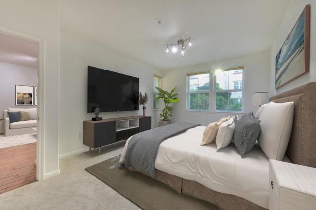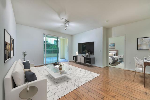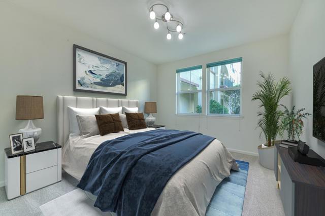 Discover this beautifully upgraded 2-bed, 2-bath, 1,259 sq ft single-level condo, built in 2007 and lovingly maintained by its original owner, located on the serene courtyard level (2nd floor) of the Terra Serena Luna community. No neighbor on one side, the spacious west-facing patio enhanced with lush greenery that offers natural privacy extends your living space and pairs perfectly with the open layout, making it ideal for relaxing, entertaining, and providing a great space for children to play and explore. The spacious primary suite features a walk-in closet, double vanity, soaking tub, and separate shower. Upgrades include stylish engineered hardwood floors, granite kitchen countertops, new carpet, fresh paint, new stainless steel appliances, new energy-efficient LED lights, and new ceiling-mount LED fixtures. Enjoy in-unit laundry, central heat and A/C, two detached private garages, and a nearby exterior storage room. The unit is also just steps from both the elevator and stairs. Community amenities include EV chargers, a clubhouse, gym, pool, jacuzzi, BBQ area, playgrounds, landscaped courtyards, and elevators. HOA dues include water, garbage, and insurance. This condo is within walking distance of the Great Mall, light rail & a nearby park. Some photos virtually staged.