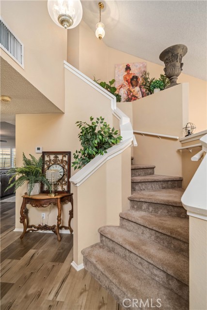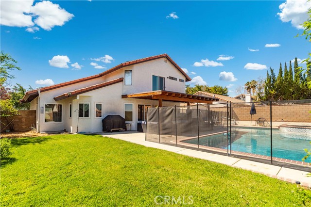 Stunning Home with Pool & RV Access in Rancho Vista! Welcome to this light and bright 4-bedroom, 2.5-bathroom home located in the Rancho Vista neighborhood of Palmdale. Featuring vaulted ceilings and high-quality laminate flooring throughout the main level, this home offers both comfort and style. The spacious kitchen boasts granite countertops and opens to the inviting family room, complete with a cozy fireplace—perfect for gatherings and relaxation. Upstairs, you'll find a convenient laundry area and plush carpeting in the bedrooms. The primary suite is a true retreat, featuring a large walk-in closet and an ensuite bath with dual sinks, a soaking tub, and a separate step-in shower. Step outside to your own private resort-style backyard, which includes a sparkling pool and spa, a covered patio for entertaining, a lush grassy area, and a large storage shed. The home also features newer windows, fresh exterior paint, and a leased solar system for energy efficiency. Additional highlights include a wide driveway with RV access and a prime location near schools, shopping, and recreational areas. Don’t miss this incredible opportunity to own a beautifully maintained home!