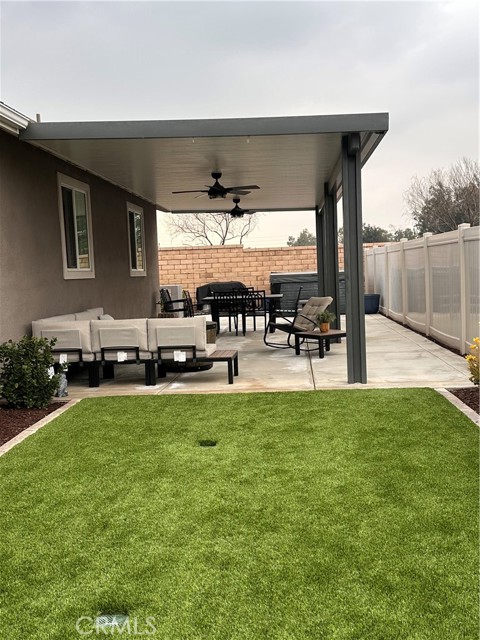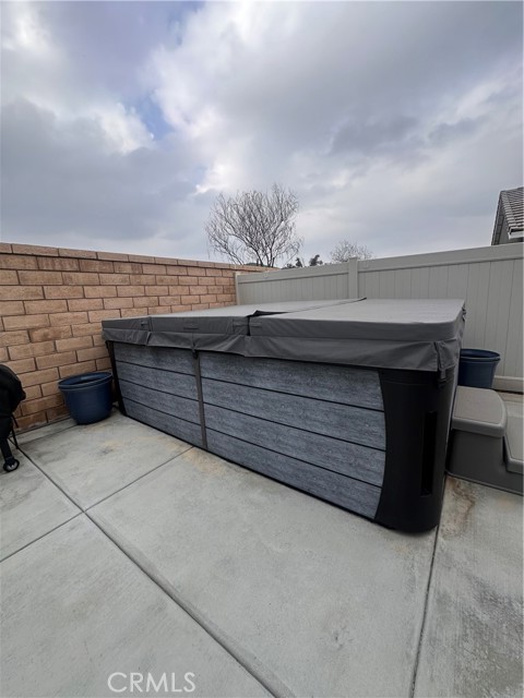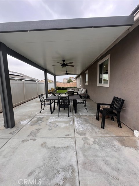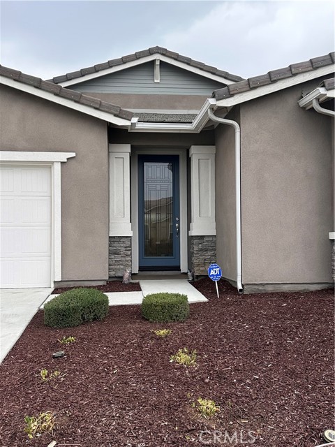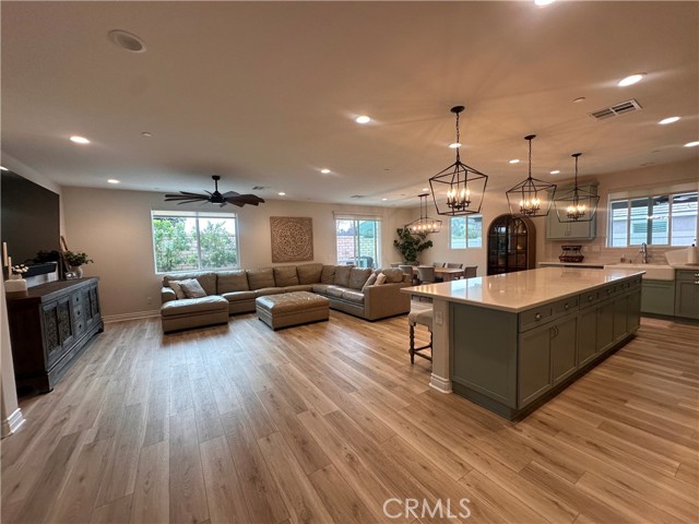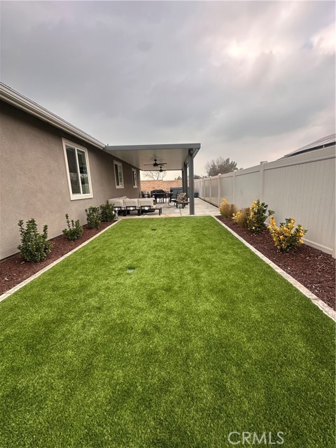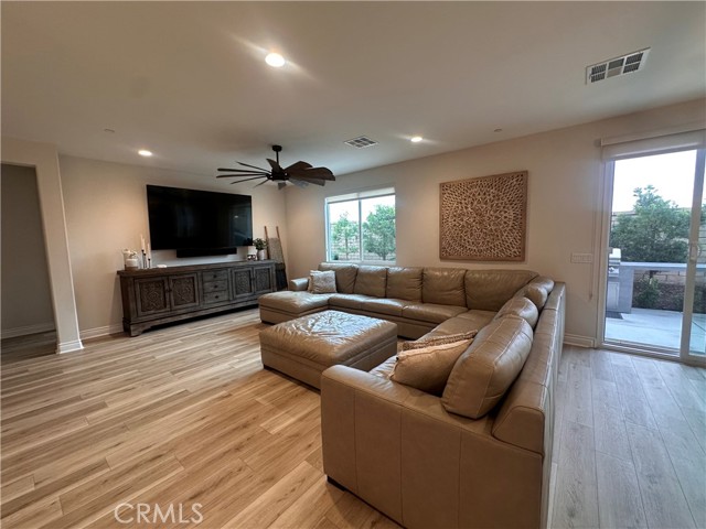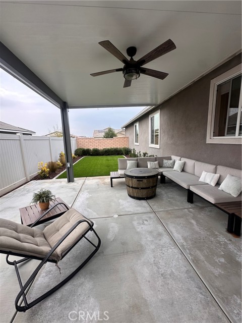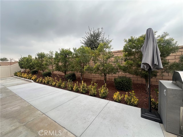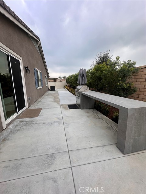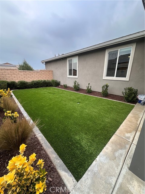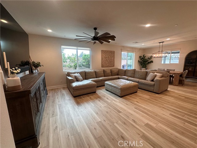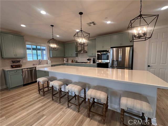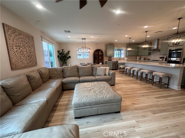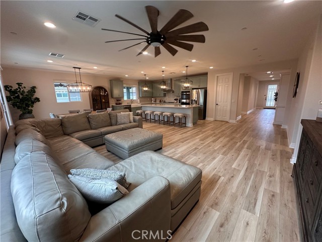 Welcome to this stunning, nearly new single-story home that truly shows like a model. Thoughtfully designed with an open-concept floor plan, this expansive residence offers approximately 2,653 square feet of beautifully finished living space, situated on a generous 8,712-square-foot lot. The home features four bedrooms and four bathrooms - three full and one half bathrooms, including two private en-suite bedrooms, ideal for multigenerational living or guests. The remaining bedrooms share a well-appointed bathroom, with an additional guest bath conveniently located near the hallway. At the heart of the home is a gourmet kitchen complete with all appliances included, an oversized 4’ x 12’ island, farmhouse sink, designer vent hood, pull-out trash/recycling, custom cabinetry, and seamless flow into the spacious great room and secondary dining area. Recessed lighting enhances both the kitchen and family room, creating a bright and welcoming atmosphere. Upgrades throughout include vinyl flooring in main living areas, plush carpet with upgraded padding in all bedrooms, tasteful ceiling fans, and upgraded window coverings. The indoor laundry room includes an electric washer and dryer for added convenience. Step outside through the sliding glass doors to a resort-style backyard, featuring an 8’ x 11’ above-ground spa, built-in BBQ island, and a fully insulated 13’ x 30’ covered patio—perfect for year-round entertaining. The front and backyard are fully hardscaped and landscaped, complete with an automatic drip irrigation system. Patio furniture is also included. Additional highlights include paid-off solar, exterior perimeter lighting, and numerous thoughtful upgrades that make this home truly move-in ready. Come experience the quality, comfort, and style this exceptional property has to offer—this is one you don’t want to miss.