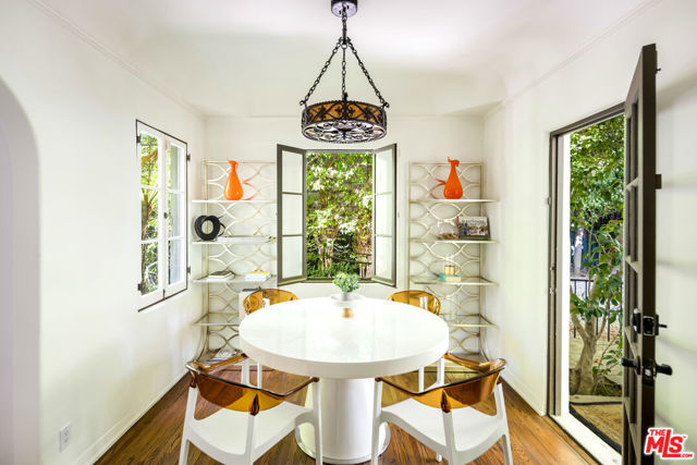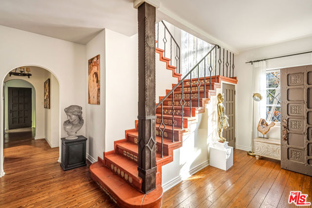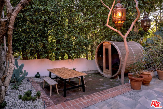 Tucked behind a veil of lush greenery and mature palms, this Spanish Revival sanctuary exudes the soul of Old Hollywood while embracing the ease of contemporary living. From the moment you enter through its arched gates, the property unfolds like a private garden estate -- framed in cascading bougainvillea, terracotta details, and the gentle sound of water echoing through an expansive front courtyard.Inside, the home balances romance and restraint. Light pours through paned windows, illuminating the warmth of plaster walls, hand-carved doors, and burnished wood floors that trace a timeless rhythm throughout. Each archway feels intentionally composed -- leading from intimate sitting rooms to airy gathering spaces, where iron sconces and Moorish lanterns glow softly at dusk. The kitchen and dining spaces invite connection, designed for meals that stretch into conversation, their windows opening to gardens thick with tropical foliage. Upstairs, the primary suite feels like a retreat within a retreat -- sun-dappled and serene -- with tree-lined views and a richly tiled bath, complete with soaking tub and dual vanity, that nods to the home's heritage.Outdoors, the estate reveals a scene of pure enchantment. A mosaic-tiled fountain anchors the sparkling pool, surrounded by lush greenery, multiple entertaining areas and lantern-lit palms against the evening sky. A shaded patio offers a ping-pong table, in addition to a tranquil space for dining with a BBQ grill. A barrel sauna and shaded lounging corners evoke resort-like seclusion, blending the serenity of a hidden spa with the charm of a Mediterranean garden.More than a home, this is an atmosphere. Situated in a sought-after pocket just moments from Los Angeles' premier shopping, dining, and nightlife, this residence captures the essence of California living.