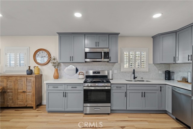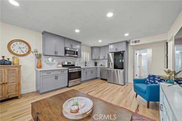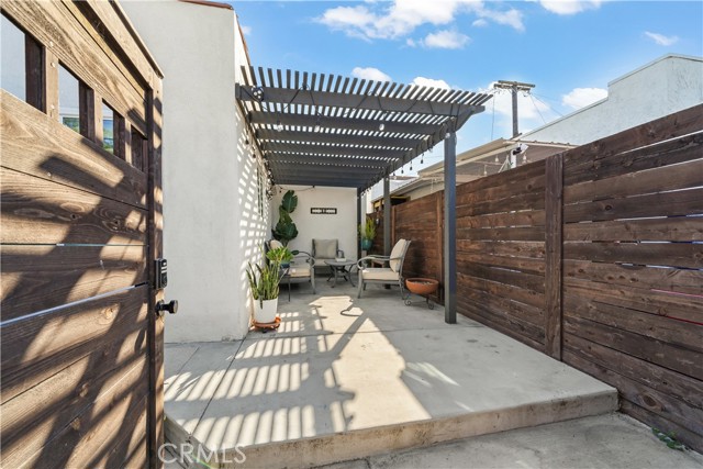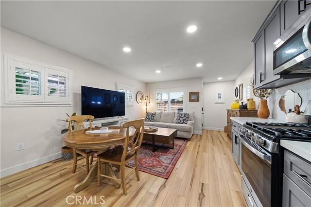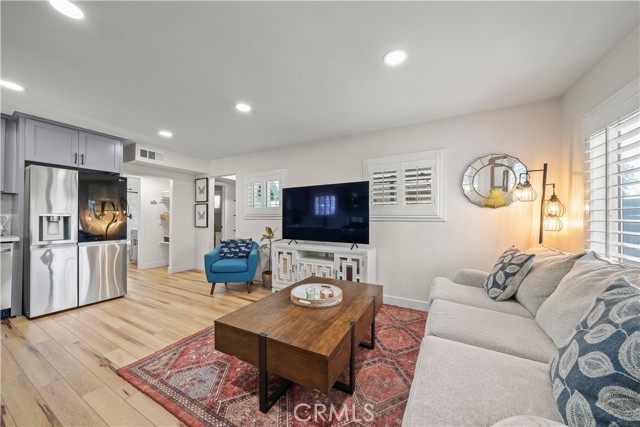 Cozy and beautifully updated, this 2-bedroom, 1-bath home features a fully fenced front courtyard with a covered patio accented by charming pub lighting—perfect for relaxing or entertaining. Upon entry, the cozy family room welcomes you with a warm and inviting atmosphere, ideal for everyday living. The remodeled interior showcases new flooring throughout (installed September 2025) and a spacious kitchen featuring gorgeous quartz countertops, a custom backsplash, upgraded cabinetry, and modern stainless steel appliances. The bathroom was recently remodeled in September 2025 and offers a stylish step-in shower with stunning finishes. Additional highlights include elegant plantation shutters, a convenient indoor laundry area, and three storage sheds at the rear of the home providing ample extra storage. Ideal for first-time buyers, downsizers, or anyone seeking a move-in-ready home filled with charm and thoughtful upgrades. Conveniently located just a few miles from Cal State University Long Beach.
