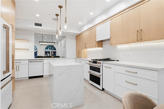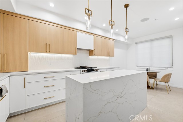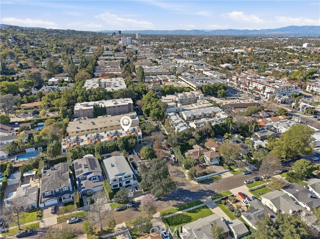 Spacious, bright, and beautifully updated, this 2-bedroom plus OFFICE townhome is ideally situated on one of Sherman Oaks’ most sought-after blocks between Stansbury and Hazeltine, just moments from the shops, dining, and lifestyle amenities along Ventura Boulevard. A formal foyer welcomes you into a thoughtfully designed home featuring in-ceiling surround sound, multiple private patios and balconies, direct access to three parking spaces, and a large in-unit laundry room updated in 2024. The oversized designer chef’s kitchen, remodeled in 2022, showcases custom wood cabinetry, chevron tile backsplash, tile flooring, Café appliances, a generous center island with dining nook, and abundant counter and storage space, all accented by curated lighting and designer finishes. An elegant dining room flows seamlessly into the sun-filled living room, where Palladium-style windows crown French doors that open to a private patio—ideal for BBQs and al fresco dining. The redesigned powder room adds a touch of modern luxury with custom hardware and refined finishes. The primary suite is a serene retreat featuring vaulted ceilings, a sitting area, walk-in closet, and French doors leading to a private balcony with tranquil treetop views. The spa-inspired primary bath offers dual sinks and a recently remodeled soaking tub. The second bedroom includes a walk-in closet and an updated adjoining bath. An expansive rooftop deck provides nearly 180-degree views, perfect for entertaining or unwinding at sunset. Additional highlights include a tankless water heater installed approximately two years ago, quick access to the 101 Freeway and nearby canyon roads to the Westside, and close proximity to Ventura Boulevard dining, shopping, Ralphs, and the new Whole Foods. This meticulously maintained building renowned for its lush, mature landscaping and inviting curb appeal.