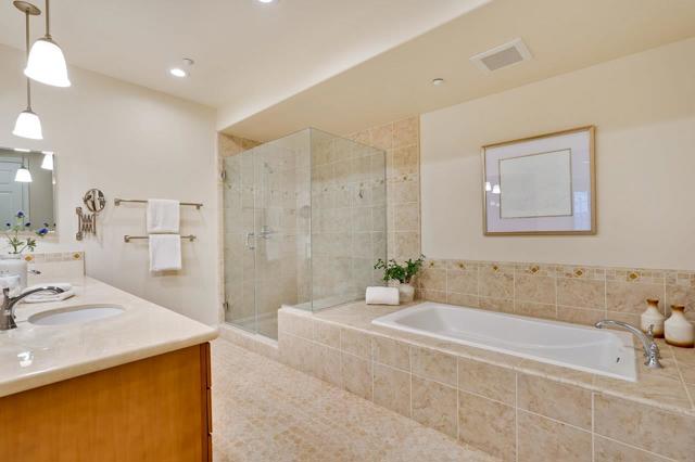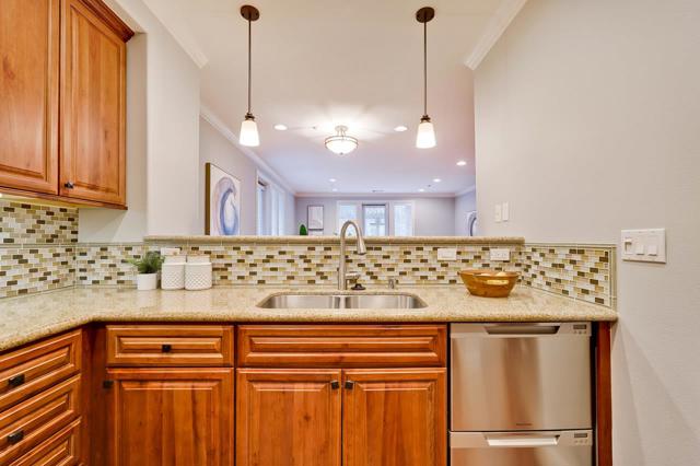 This one is a beauty! A prime ground floor corner unit in the charming Willow Glen Place! The comfortable living space features rich hardwood floors and two walls of doors and windows opening to a large wrap-around private patio in a quiet corner of the community. The high ceilings with crown moldings, custom window blinds and a gas fireplace complete the sophisticated look. The chef's kitchen features stainless steel appliances, gas range, dark wood cabinetry and granite counters with a convenient breakfast bar. The spacious primary suite has a luxurious bath with a dual sink vanity, deep soaking tub and a separate walk-in shower. The second bedroom is also spacious and has custom window treatments. Both bedrooms feature new carpeting and large walk-in closets outfitted with Elfa organizers. The central heat and A/C is controlled by a Nest thermostat. There are two designated parking spaces in the secure, underground garage and an additional private storage locker. Willow Glen Place is a well-kept and sophisticated community with a fully equipped gym, pool and spa and secure common areas with serene landscaping. It is ideally located within walking distance of local businesses and with easy access to shopping and convenient commute routes. What a great place to call home!