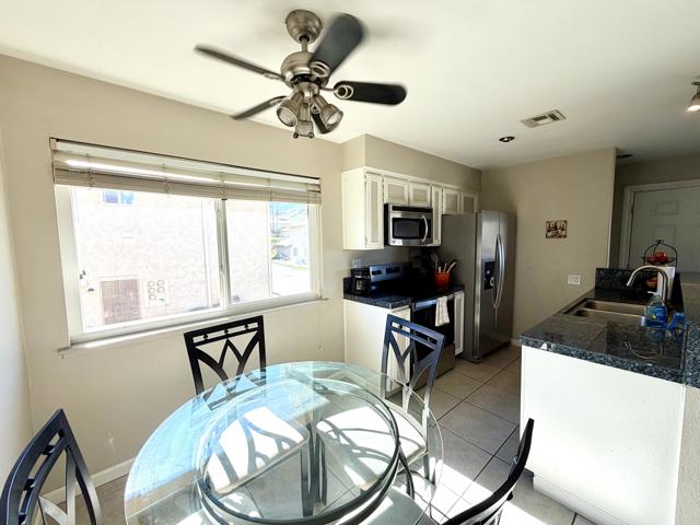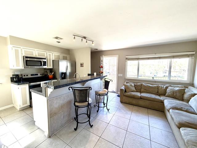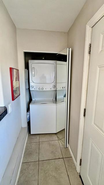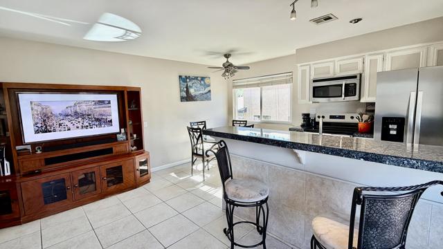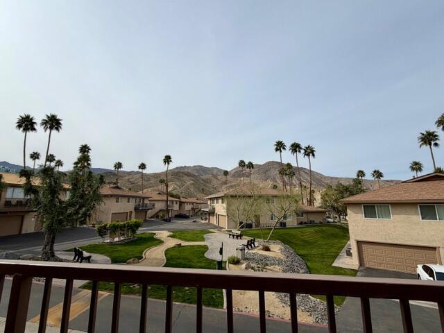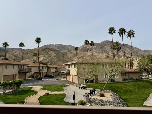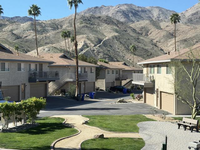 Located in the highly sought-after South Palm Desert, this charming upper unit, residence offers breathtaking mountain views and exceptional value. Enjoy stunning vistas from the living room and balcony, creating the perfect setting to relax and take in the desert beauty.The open-concept floor plan seamlessly connects the living, dining, and kitchen areas, providing a spacious and functional layout ideal for everyday living and entertaining. The kitchen features a newer dishwasher and stove, while updated dual-pane windows enhance comfort and energy efficiency.The living room is equipped with a motorized shutter. Ceiling fans in the dining area and both bedrooms add to year-round comfort.This home includes two bedrooms and one bathroom, offering flexibility for full-time living, seasonal enjoyment, or investment potential.Additional conveniences include an in-unit combo washer/dryer, plus access to a community laundry room. Residents also enjoy two community pools, a shared garage with private storage cupboard, and an HOA that includes water and trash service.Ideally located close to scenic hiking trails, shopping, dining, and outdoor recreation. This is desert living at its best.