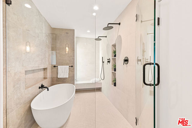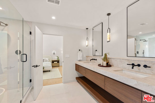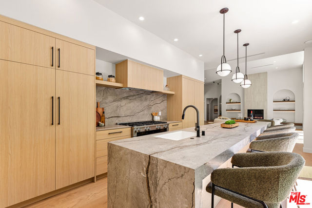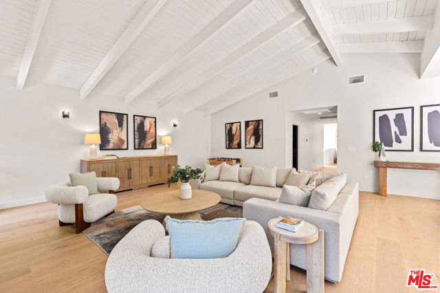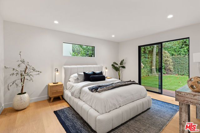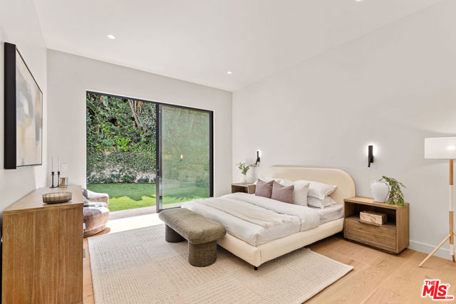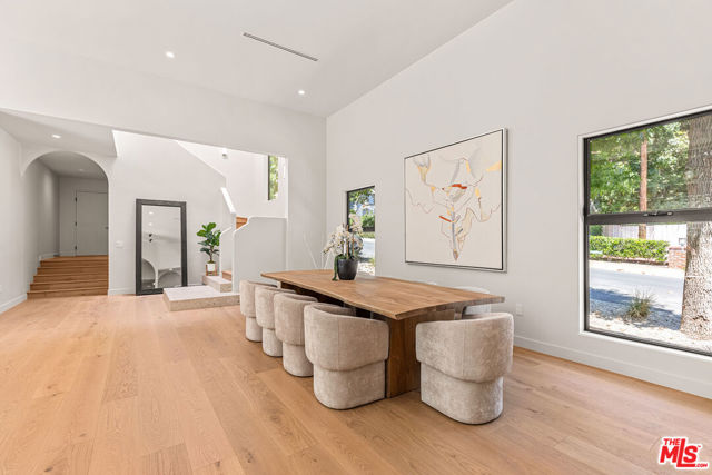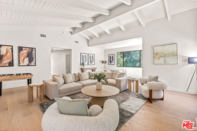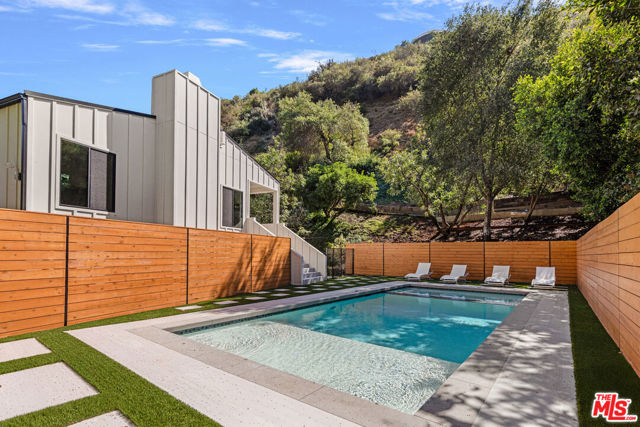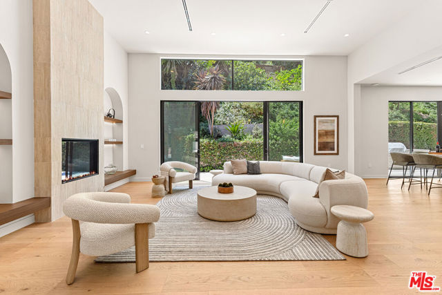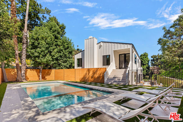 Tucked away on a peaceful street in one of Brentwood's most coveted enclaves, this strikingly updated 4-bedroom, 6-bath modern residence offers refined design, impressive scale, and effortless livability. A dramatic 10-foot entry door opens to a voluminous interior highlighted by soaring 14-foot ceilings and an expansive, open layout ideal for both everyday living and entertaining. The heart of the home features a chef-caliber kitchen equipped with top-tier appliances, an oversized dining area, and multiple living spaces designed for seamless flow. These areas connect effortlessly to a private backyard retreat, complete with a newly constructed pool and spa, along with dedicated spaces for outdoor dining and relaxation.The primary suite serves as a true sanctuary, boasting a spa-inspired bathroom with dual vanities, a freestanding soaking tub, and a custom walk-in closet. Additional amenities include two thoughtfully placed powder rooms, a newly added theater, and a spacious entertainment lounge with a fireplace perfect for hosting gatherings or enjoying quiet evenings at home. Notable upgrades include a fire-resistant standing-seam metal roof, fully updated electrical and plumbing systems, and a generous three-car garage with ample storage. A rare opportunity to own a turnkey modern home in a premier Brentwood location.