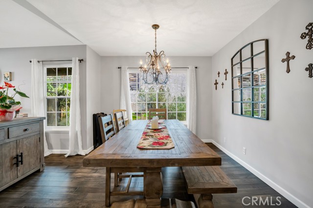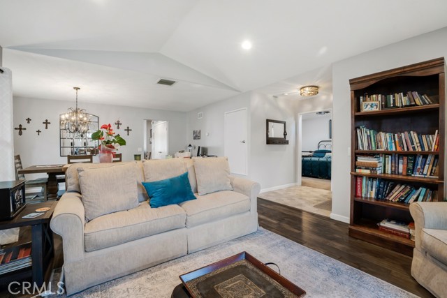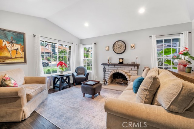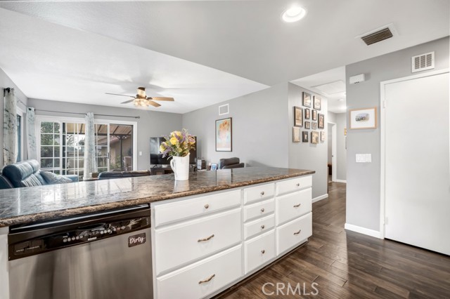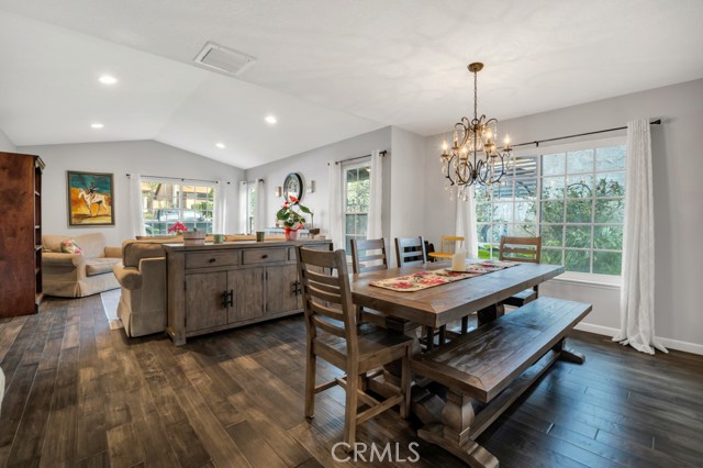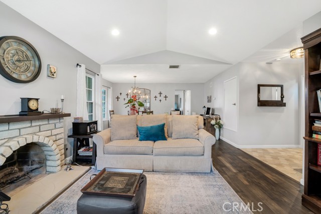 Welcome to a singles story Country View Villa home nestled in a double cul-de-sac in the beautiful Rancho Cascades community. The covered front porch leads to a formal entryway which opens to the living room and dining areas that feature engineered hardwood floors and a wood burning fireplace with gas starter for ease of use. Beyond the dining area is the updated kitchen with granite counters and a breakfast bar which opens to the family room. The family bedrooms are to the right and there is the convenience of a laundry closet in the hall with washer and dryer. The primary suite is at the front of the house with its own patio. It has a remodeled private bath with double sinks and a large walk in shower. Outside the family room, at the rear of the house is a wonderful patio with a new cover, that expands the living space and has lush landscaping to enjoy. The yard has a dog run and there is a detached 2 car garage with alley access. The zero lot line concept allows for maximum use of the property for building size and lot utility.