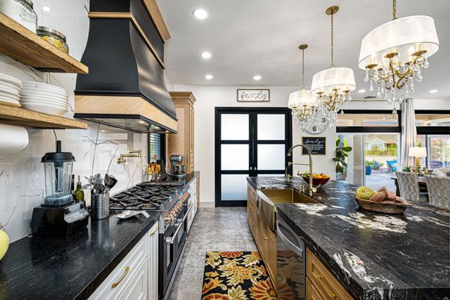 Enter through leaded glass double doors into an open concept living/dining area with added electric fireplace. The 'Chef's' kitchen features a 10' stone island, coordinating stone perimeter, and a coffee/tea bar. A 48' Italian dual fuel stove with custom vent hood encased in wood, creates a cook's workshop. French design cabinetry includes large pantry with slide-out shelves.The master bath has an extended walk-in shower, soaking tub, and double vanity. The office/den/ guest room offers privacy with pocket doors.A glass slider opens to a lush yard for stargazing. Close to amenities like golf, sport courts, and clubs.