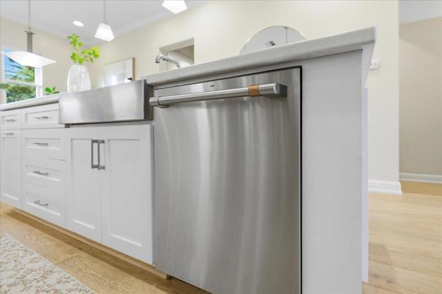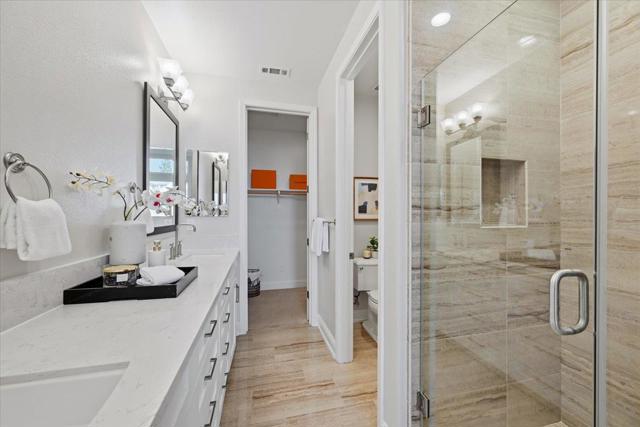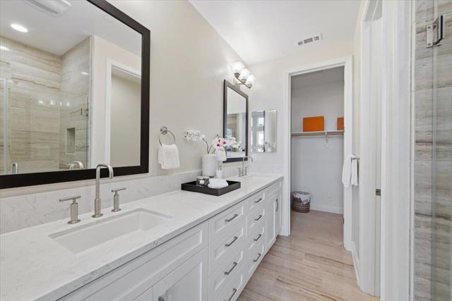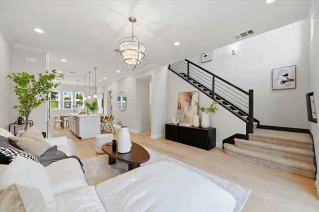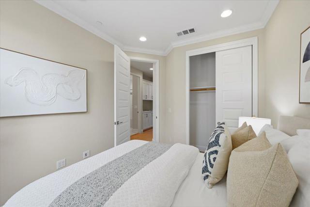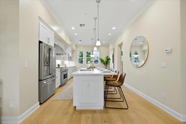 Nestled in the heart of Silicon Valley, this desirable Mountain View PUD townhome offers an ideal blend of comfort, style, and convenience. Situated on a premium lot, the open-concept home features 4 bedrooms, 3.5 bathrooms, and approximately 1,907 sq ft of bright, thoughtfully designed living space filled with natural light. A private first-floor bedroom suite is ideal for guests or a home office. The second level showcases a spacious living and dining area centered around a gourmet kitchen with high-end Cafe appliances, including a Cafe Monogram range, hood, dishwasher, and refrigerator, complemented by an updated island countertop and full-height backsplash. Hardwood flooring runs throughout, along with upgraded crown molding. The top floor offers a luxurious primary suite with a walk-in closet, dual vanities, and wet/dry bath separation, plus two additional bedrooms and an upgraded bathroom. Additional highlights include central HVAC, a tankless water heater, and a newly epoxied two-car garage. Conveniently located near major tech campuses, highways, and award-winning Mountain View-Los Altos schools, including Los Altos High.
