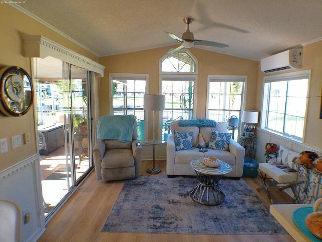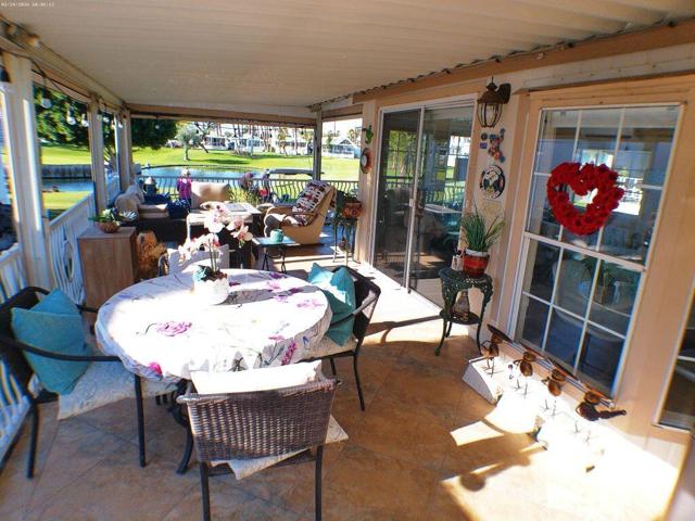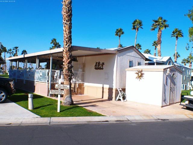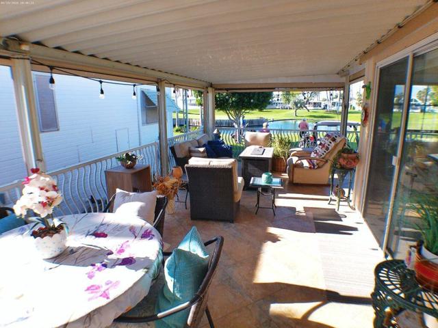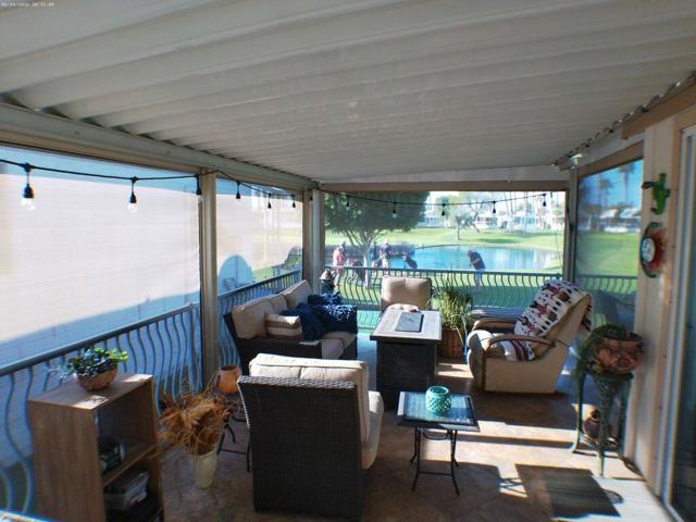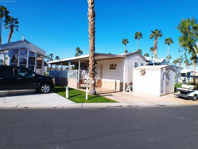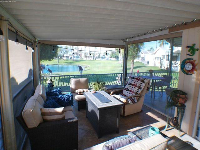 Located on the 6th Tee Box. Views of Golf Course, Pond, Fountain and Mountains in Background. Awesome Sunsets from your wrap around deck which offers auto roll down screens. Built in electric fireplace, corion counter tops, W/D in shed. Covered Patio, bright and Aire inside the Park Model.