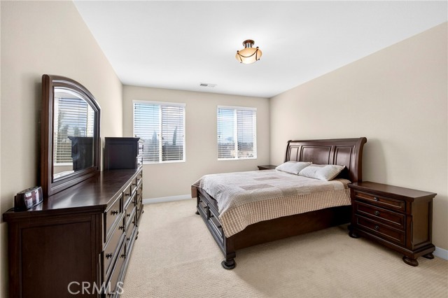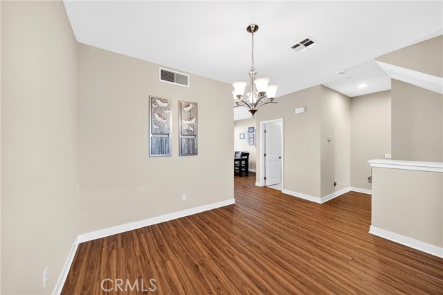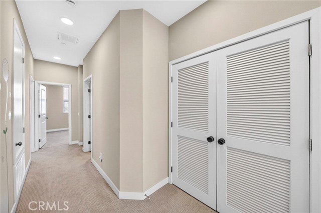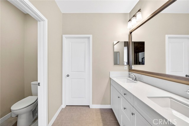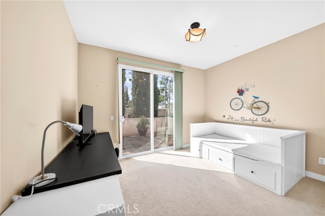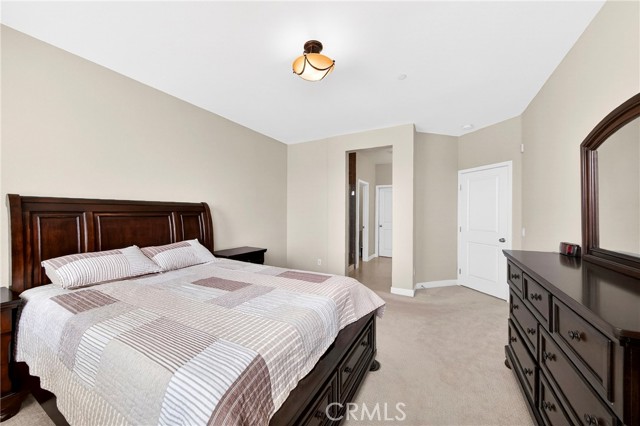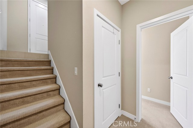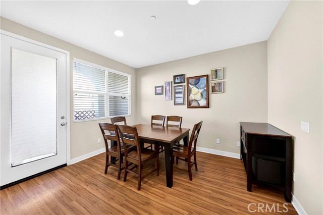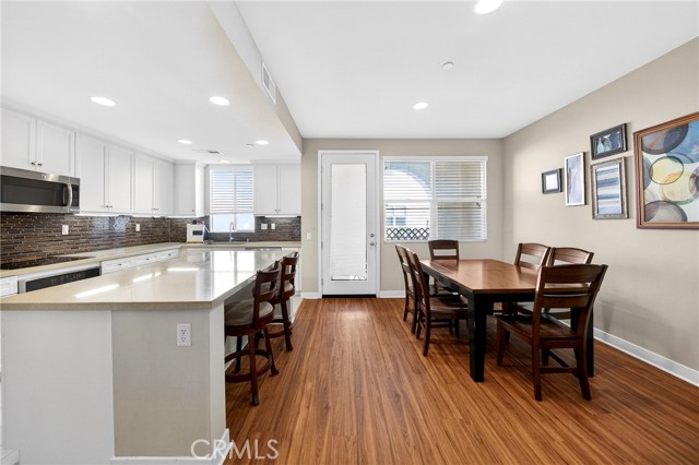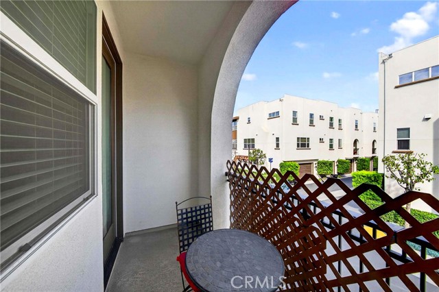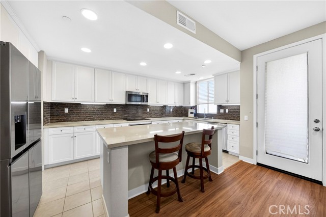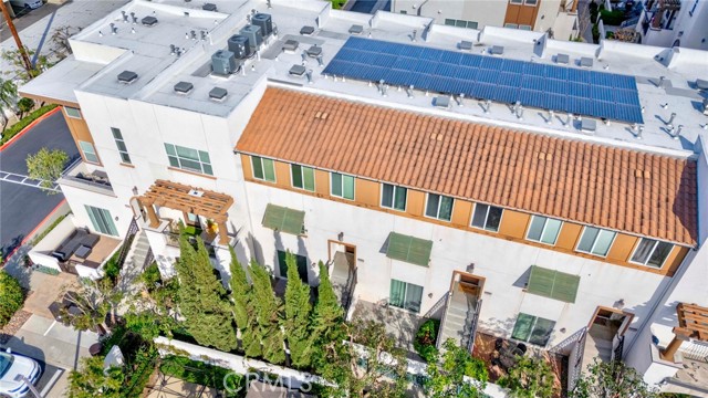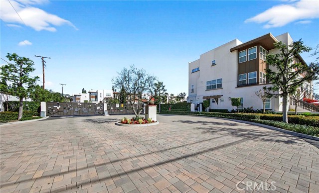 Modern tri-level residence located within the gated Downey Collection Community, developed by the highly regarded City Ventures Company. This four-bedroom, 3.5-bath home features a thoughtfully designed layout and a desirable interior location, offering comfort, functionality, and contemporary style throughout. Abundant natural light fills the home through large windows, complemented by warm laminate wood flooring. A welcoming front porch leads to the first level, which includes direct access to the two-car garage and a primary suite with an en-suite bathroom and sliding doors opening to a spacious front patio. The second level is designed for both everyday living and entertaining, featuring a bright great room where the living room flows seamlessly into the dining area and kitchen. The kitchen is well-appointed with Corian countertops, stainless steel appliances, and a large center island with bar seating. A powder room and an inviting balcony complete this level. The third level features a second primary suite with a walk-in closet and an en-suite bathroom with dual sinks and a walk-in shower. Two additional generously sized bedrooms share a full hall bathroom, and the laundry area is conveniently located on this level. Paid-off solar panels were installed by the builder. Residents enjoy access to the community pool and BBQ area. Ideally situated near shopping, dining, and the 5 Freeway, this home offers a well-connected lifestyle within a gated community.