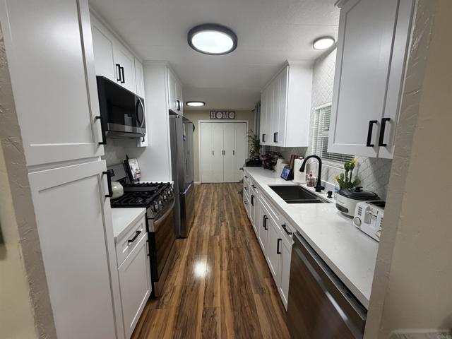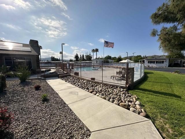 Welcome to Santee living at its finest! Step into this beautifully updated home featuring a newly remodeled kitchen with quartz countertops, a stylish tile backsplash, and a custom coffee bar. Enjoy new stainless steel appliances, overhead lighting in both the kitchen and living room, and fresh paint throughout. Natural light floods the home with updated windows, including those in the spacious California room – perfect for relaxing and entertaining. The primary bathroom offers comfort and accessibility with a walk-in Jacuzzi tub, while both bathrooms feature skylights, that brighten the space naturally Stay cool Year-round with a recently serviced air conditioner that keeps the home frosty cool. The entire house has been insulated with sound proofing materials and T1 eleven-composit wood, which not only looks pristine but keeps utilities cost down. The front yard is beautifully manicured, accented with elegant solar lighting, creating great curb appeal. The backyard is a private oasis, complete with colored solar lights, fruit trees, and multiple sitting areas – ideal for enjoying Southern California evenings. Meadowbrook is a gated community offering a scenic and resort like atmosphere. With a wealth of amenities, such as a sparkling pool, relaxing Jacuzzi, billiards and game rooms, library, and a vibrant clubhouse. The clubhouse serves as the hub of the community featuring many activities, such as potluck, bingo, game night, crafting, yoga, and water aerobics. With shops and parks near by featuring hiking trails, and Pickleball, this community has it all.