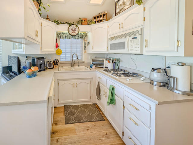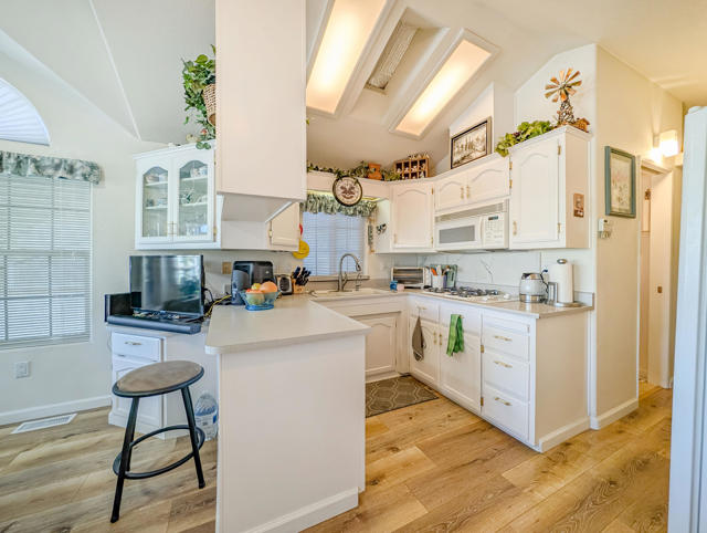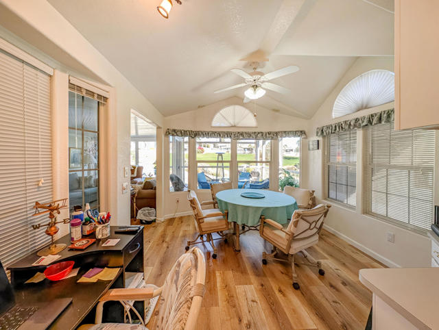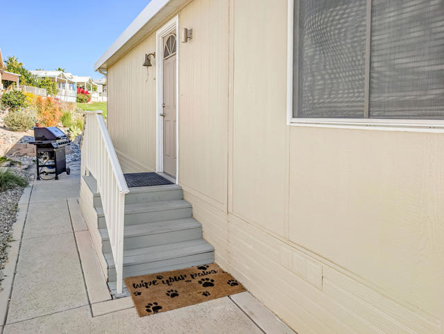 Enjoy stunning views from the 9th hole of the golf course in this attractive ~800 sq. ft. 2-bedroom, 11/2-bath 2002 Hallmark Park Model home. The spacious California room features wall-to-wall sliding doors that seamlessly connect to the outdoor tiled, wind protected deck and overlook the paver stone courtyard, out to the scenic 9th hole and water feature, enjoy the cool evenings with outdoor heater. Recent upgrades include new flooring, fresh interior paint, a new hot water tank, reverse osmosis drinking filter, tiled walk-in shower, and more. You'll also find plenty of storage in the large shed, plus paved parking for two vehicles. Located within the premier 55+ Caliente Springs Resort, this property gives you access to outstanding amenities: mineral hot spring-fed pool and spas, a modern fitness center, a 9-hole golf course, 8 pickleball courts, tennis courts, laundry facilities, a library, and a lively, welcoming community. Don't miss your chance to tour this upgraded home--you may find it's just what you've been looking for! Please note: the lot is leased with a space rent of $950.