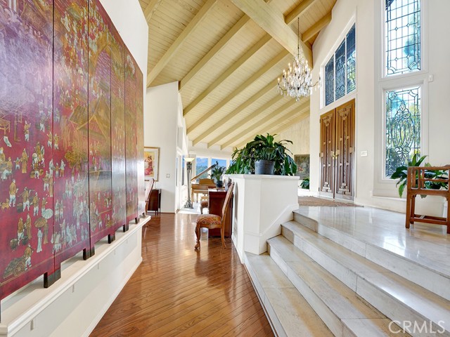 Dramatic 180 degree views of Tustin, Irvine, Fullerton and sunset over the Pacific from this custom gated estate home nestled in the hills of North Tustin. Boasting a large 7,622 sf open space floor plan for family living and entertaining, the home was designed by award winning architect Ron Yeo. Conceived for a family lifestyle with an emphasis on entertainment - from its soaring ceilings to its large sit down bar & media center, private Wine Tasting Room with chilled cellar, Family Entertainment Center w pool table, fitness space w barre, bar, and hot rock sauna, all with access to outdoor decks and a resort style natural rock waterfall solar-heated pool, spa and built-in BBQ - the home follows family, fun and function. An elegant entrance welcomes with mini-garden, large crystal chandelier and THE VIEWS opening the home to the living room with fireplace and dining room with crystal chandelier. The adjacent kitchen with breakfast nook and outdoor patio is intimate and accessible. Stepping down to the seated bar & media area, the home opens up further to the family room with copper fireplace including a reading nook and access to the large pool deck. Continuing along the view deck multiple doors open to the Family Entertainment Center and an adjacent convertible office/library incorporating another copper fireplace, built-in bookcase conveniently located just below the living room and entry foyer with direct stairway access. Upstairs bedrooms feature a large master with fireplace, outdoor deck and master closet with built-in island cabinet. The master bath impresses with a 2 head shower, spa tub, double sinks, garden feature, skylight and 2 chandeliers. Additional living space includes 2 en suite bedrooms with private patios, and a 4th bedroom with adjacent bath. Other unique features of this blended living space include a Zen garden retreat with water feature, 3 car garage with extensive built-in storage cabinets and workbench, integrated alarm and intercom system, central vacuum, 2 tankless water heaters, 4 furnaces, 4 a/c units, 2 skylights and hardwood floors to name just a few of the many luxury features of this estate. The home’s exterior was painted in 2023 with new decks installed in the last 3 years. A key safety feature provides crucial wildfire protection with an integrated roof sprinkler system and strategically located controls in the master bedroom and garage.