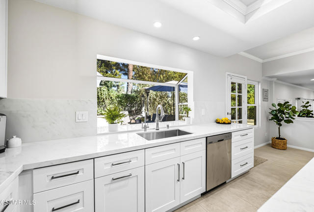 Guard-gated luxury in the heart of Thousand Oaks. Located within the prestigious, 24-hour guard-gated community of Chanteclair, this expansive 5-bedroom, 4-bathroom home offers 3,354 sq ft of move-in-ready living designed for both everyday comfort and effortless entertaining.The heart of the home is a remodeled chef's kitchen featuring quartz countertops, a large center island, custom cabinetry, double ovens, and a gas range, all opening seamlessly to the inviting family room with built-in bookcases, surround sound, fireplace, and custom bar--ideal for gatherings large and small.Soaring ceilings and rich hardwood floors elevate the formal living and dining rooms, creating a bright yet refined atmosphere. A full bedroom and bath on the main level offers flexibility for guests, multi-generational living, or a private home office.Upstairs, the oversized primary suite is a true retreat with a double-sided fireplace, sitting area, and spa-inspired ensuite bath featuring dual vanities, soaking tub, walk-in shower, and generous closet space. Three additional bedrooms and a full hall bath complete the second level.Enjoy the privacy, security, and exclusivity of a guard-gated neighborhood, just minutes from parks, scenic hiking trails, shopping, dining, and top-rated Conejo Valley schools. With its highly desirable floor plan and prime location, this home represents an exceptional opportunity in one of Thousand Oaks' most sought-after communities.
