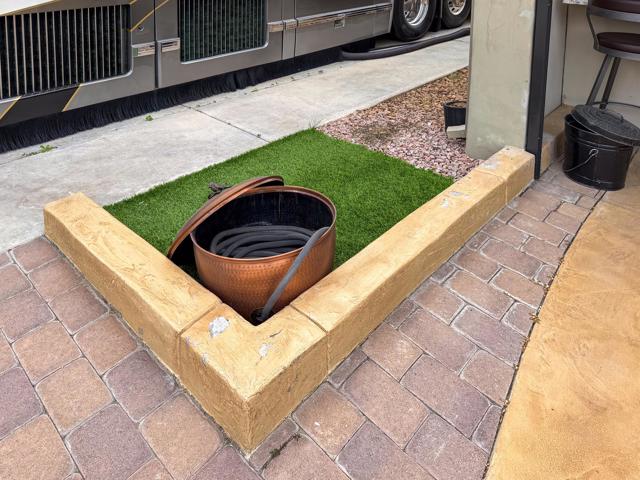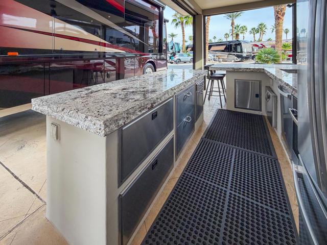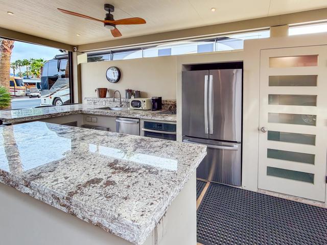 This upgraded pergola RV lot at Outdoor Resort Indio offers a desirable southern exposure with sweeping mountain, lake, and golf course views in a very private setting. The long pergola features a large granite outdoor kitchen with island, five-seat built-in bar, stainless sink with hot water and disposal, oven, dishwasher, and abundant storage--ideal for entertaining.Enjoy wrap-around electric screens, three ceiling heaters, and two ceiling fans for added comfort. A privacy wall with full-size refrigerator and pantry adds function, while a built-in entertainment center with fireplace anchors the living area. The coated RV pad and a separate matching BBQ kitchen with under-counter fridge complete the setup.Additional highlights include a dining table with six chairs, fire table with seating, chaise loungers, large umbrella, and a spacious rear relaxation area. South-facing with the coach windshield to the north, this lot is a short walk to the clubhouse and offers tranquil fountain sounds and expansive views for refined resort living.Outdoor Resort Indio is a Class A RV only resort.