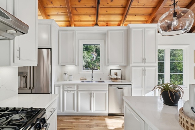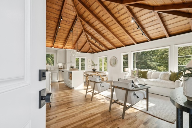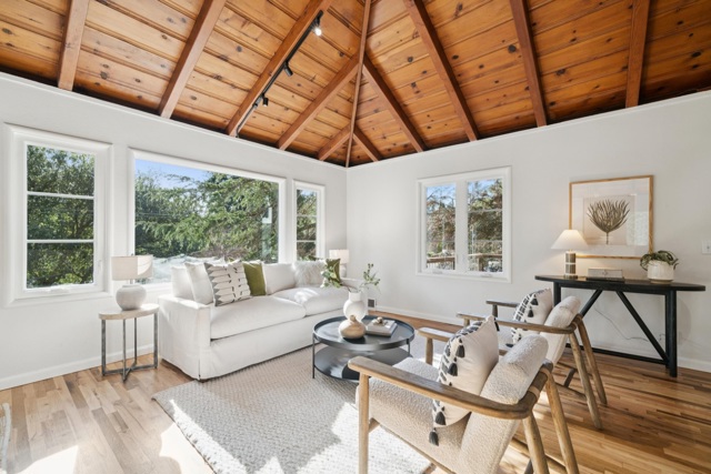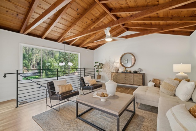 Drenched in sunlight, this sophisticated home features soaring vaulted ceilings and an open-concept floor plan for effortless California living. Antique oak floors, designer lighting, and custom railings add warmth, while nature-filled windows frame serene views. Seamless indoor-outdoor flow connects living spaces to expansive decks, perfect for entertaining. The remodeled kitchen is stylish and functional, with a large island, Caesarstone countertops and backsplash, generous cabinetry, and elegant finishes. Designer bathrooms feature contemporary vanities, designer flooring, and refined details. Four bedrooms and two baths are on the main level, including a primary with French doors to a peaceful patio. The lower level offers versatile living with a separate entrance, ideal for a home office, au pair, or extended family, while the upper level includes a spacious living room/den with natural beam ceilings. Mature landscaping, including a plum tree, enhances the setting, while a two-car garage with an adjacent storage room accommodates activity gear. Moments from Montclair Village—with tennis courts, parks, and a storybook library—and close to San Francisco transportation, this home is a rare urban retreat where timeless design, modern comfort, and natural beauty exist in harmony.