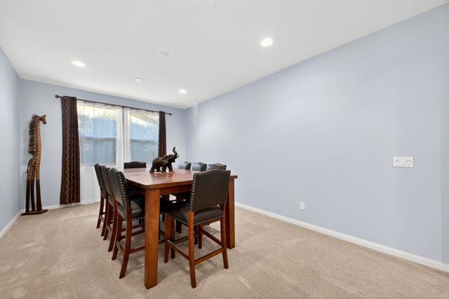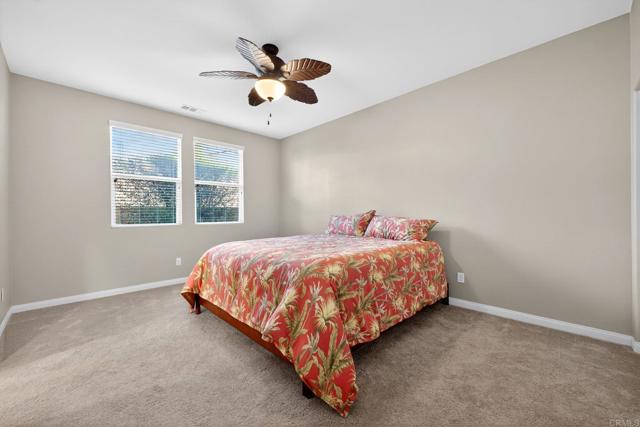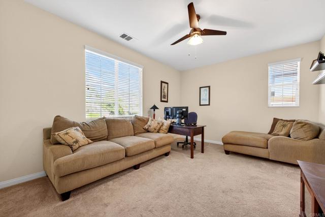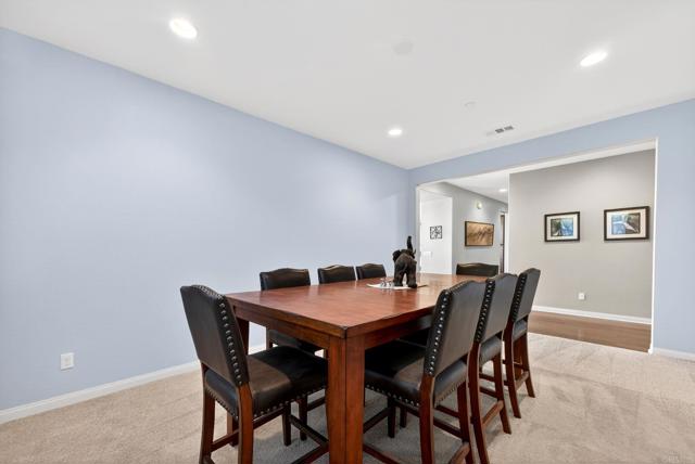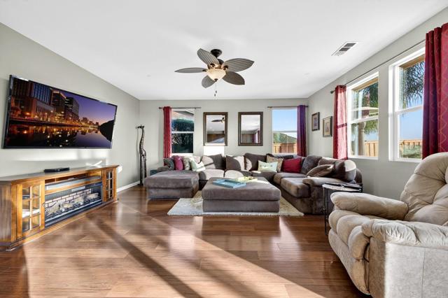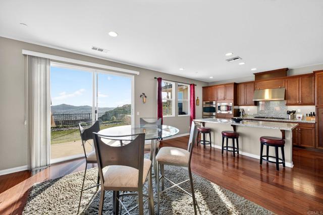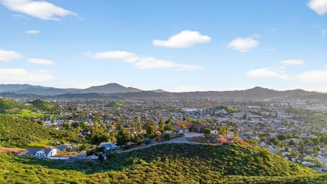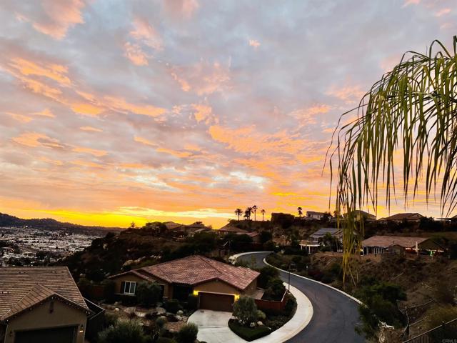 Nestled within the exclusive community of Sky Ranch well above the city of Santee, this original owner, turnkey single level home is set along a quiet, picturesque street, that lives up to its name, offering beautiful surroundings, well planned design with a panoramic view of city lights and stunning sunsets. This ranch-style residence epitomizes Southern California living at its finest. This home spans approximately 3,003 square feet and features a thoughtful layout with four bedrooms and three full bathrooms, offering both comfort and style for everyday living or festive entertaining. Built in 2013, the property showcases true California style architectural amidst a quiet neighborhood. The fully landscaped lot with palms, turf, a huge plumeria tree and drought tolerant areas offers privacy and is fully irrigated, full drip system front and back yard and slope is sprinklers. All on timers. There is room for a garden, dog run, or elegant entertaining under the California sun or sunset happy hours and quiet mornings with coffee. Inside, the well-proportioned rooms are infused with natural light and flow effortlessly from room to room, creating an inviting sense of home. The foyer opens to a wide hallway leading to the main living area. An open and inviting common area features a kitchen with a huge island complete with bar seating, granite, stainless and dark wood cabinetry with an adjacent large formal dining room. The formal dining room could alternatively be used as a game room, office, home gym or hobby area. Additionally, it could be converted to another bedroom. The well thought out floor plan balances privacy with proximity with an impressive primary bedroom including a large bath and generous walk-in closet. The primary bath features a custom tiled shower and separate large soaking tub and dual sinks. The second bedroom/office is adjacent to the guest bath. The third and fourth bedrooms are connected by an entry with storage. They are joined by a jack and jill bath complete with dual sinks on the opposite side of the home from the primary suite for privacy. Additional features include owned solar and a large pantry area for extra kitchen storage. Tri-zone climate control for personalized comfort and energy conservation. The home features ceiling fans in every room and recessed canned lighting with dimmable controls. The oversized laundry room is conveniently located outside the primary suite. Key pad controlled smart door locks are located on the front door and garage door for convenience and security. The large three-car garage has a tandem space that could be used as a workshop, craft area or general storage. Gorgeous neighborhood ideal for walking and hiking. Dog-friendly community with regular activities including taco nights and holiday celebrations. Convenient access to freeways 67, 52, and 8 (just 5 minutes away). Situated close to well-regarded schools, lush parks, and local amenities, this home embodies the desirable blend of suburban tranquility and everyday accessibility that defines Sky Ranch living