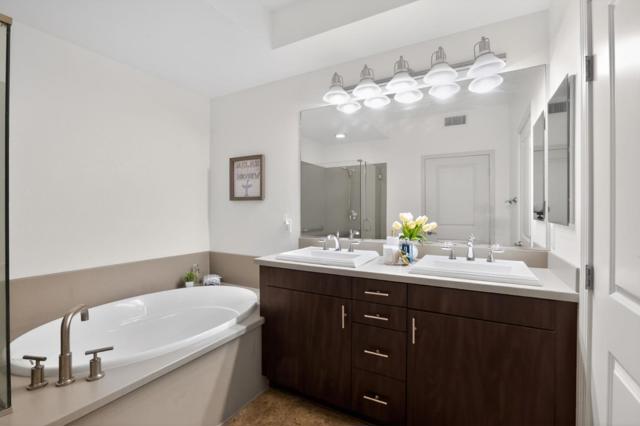 Welcome home to a beautiful gated complex in a great location. Discover comfort and convenience in this charming 2-bedroom, 2-bathroom home. The well-appointed kitchen is equipped with modern amenities, plenty of cabinets and lots of counter space. Central heating and air conditioning ensure year-round comfort. The primary suite offers a walk-in closet, a bathroom featuring double sinks and an oversized tub along with a separate stall shower. Laundry is conveniently located inside the home, complete with a washer and dryer. This residence is situated within the Cupertino Union School District. With two secure parking spaces, fitness center, putting green and inner courtyard, this home combines practicality with style, making it an ideal choice for those seeking a comfortable lifestyle in Cupertino.