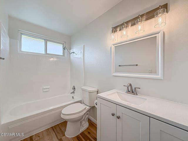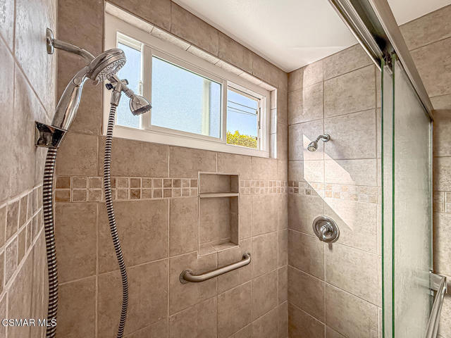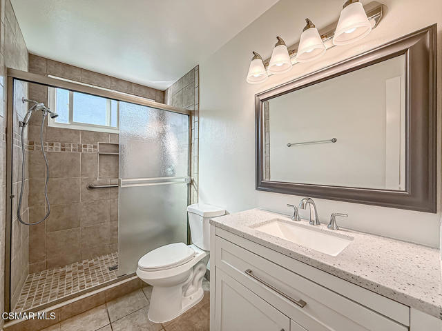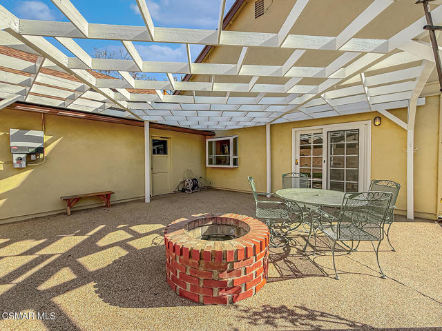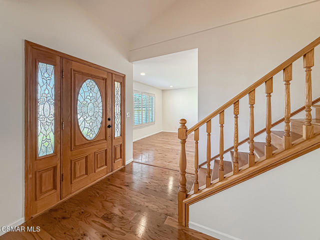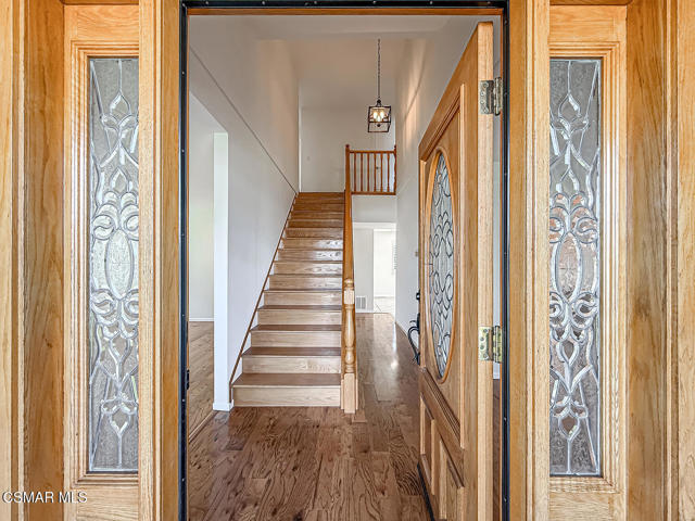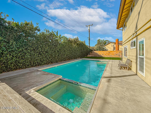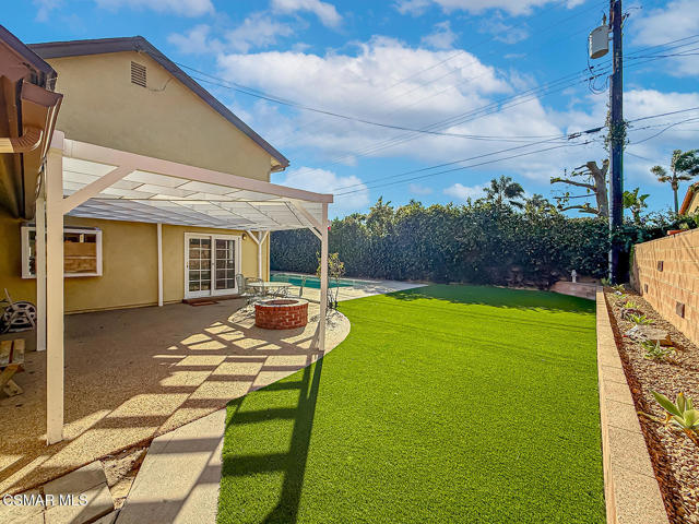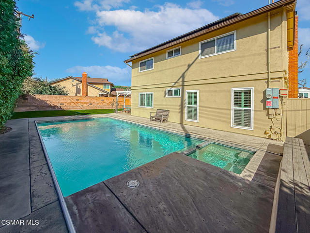 Charming POOL Home with OWNED SOLAR and BACKUP BATTERY on a END of Cul-De-Sac location! Tucked into a peaceful residential pocket just a short stroll from Foothill Park, this tastefully updated 5-bedroom residence offers a spacious backyard retreat and a regal curb appeal enhanced by sprawling grass lawns, a gracefully curved concrete walkway, and a tile-surfaced front porch--welcoming you to the elegant beveled-glass front door. Inside, the entire interior has been FRESHLY repainted and the ceilings have been NEWLY scraped to enhance brightness and create a crisp, move-in ready atmosphere. The main Living Room is spacious and inviting, showcasing handsome REAL wood flooring, plantation-shuttered windows, a gas fireplace, and BRAND-NEW recessed lighting. Adjacent, the Formal Dining Room continues the real wood flooring and enjoys its own plantation-shuttered windows + updated light fixture, making it a fantastic space for both casual and formal gatherings.The Kitchen is generously sized and bathed in natural light, appointed with recessed lighting, tile countertops, and designer stainless-steel appliances including a WOLF gas range beneath a stainless-steel range hood, BOSCH dishwasher, and a 2-door KITCHENAID refrigerator. Additional highlights include a garden window, roomy pantry with pull-out shelving, and sliding glass doors that open to the backyard--perfect for entertaining and everyday living. The Kitchen Eating Area provides a comfortable space to enjoy daily meals while taking in the view. Downstairs, the Primary Bedroom offers real wood flooring, recessed lighting, two closets with bifold doors, plantation-shuttered windows, and an en-suite bathroom upgraded with a stone-topped vanity and tile-walled shower featuring dual shower-heads. A deep under-stair storage closet provides excellent functionality and hidden storage options.Upstairs, four additional bedrooms offer thoughtful layouts and plenty of flexibility. Bedroom #1 includes a ceiling fan, plantation-shuttered windows, a built-in window bench with storage, and a sliding wardrobe closet. Bedroom #2 offers traditional proportions and sliding wardrobe closet doors. Bedroom #3 has been fitted with a built-in desk, ideal for use as a home office or study space. Bedroom #4 enjoys a ceiling fan and sliding wardrobe closet, completing a comfortable second-floor layout. Two separate upstairs hallway closets provide additional linen and storage space, and the upgraded Hall Bathroom includes a modern built-in vanity and a NEWLY glazed tub/shower! Each room throughout this home feels BRIGHT!The Backyard is a PRIVATE outdoor retreat, designed for relaxation and entertaining with a sparkling in-ground pool + spa fitted with an AUTOMATIC safety cover. BRAND-NEW artificial grass lawns add beauty with minimal maintenance, and a spacious covered concrete patio with a freshly painted patio cover provides a shaded zone for dining, lounging, or outdoor gatherings. Additional upgrades include a FULLY OWNED SOLAR system with BACKUP BATTERY to deliver energy efficiency & peace of mind, as well as a NEWER Rheem water heater. The home is ALSO plumbed for soft water throughout. A 2-car garage provides ample storage and everyday convenience. This special home is ideally located near scenic parks, highly regarded local schools, shopping, dining, and commuter routes--offering that rare combination of comfort, privacy, and efficiency in one of Camarillo's most desirable neighborhoods!