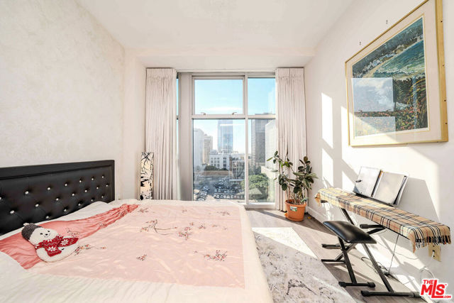 Welcome to The Summit on Sixth, one of Koreatown's most prestigious high-rise residences. This spacious 2-bedroom, 2-bathroom model unit spans 1,770 sq ft and features custom designer upgrades throughout, including new flooring and a fully remodeled bathroom. Step into a modern open-concept floor plan with soaring high ceilings and floor-to-ceiling windows that flood the space with natural light and offer breathtaking sunny south - facing city and city views. The chef's kitchen is equipped with quartz countertops, chic modern cabinetry, and premium appliances. Each of the two large master suites is positioned on opposite sides of the expansive living room for optimal privacy perfect for guests or roommates. Additional highlights include: Washer and dryer in-unit Two assigned parking spaces Wood flooring throughout High-end finishes and fixtures. Residents enjoy access to resort-style amenities, including: 24-hour security and concierge service. State-of-the-art fitness center, sauna. Prime Koreatown location just one block from Wilshire/Vermont Station. HOA includes cable, internet, and water. Don't miss this rare opportunity to own a beautifully upgraded home in one of LA's most sought-after urban communities.
