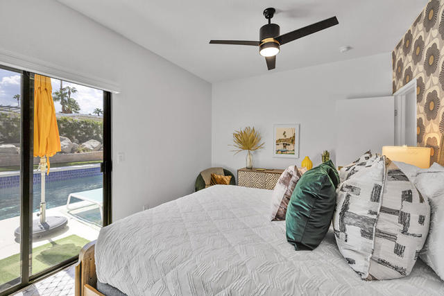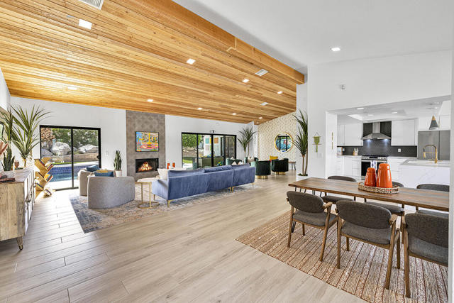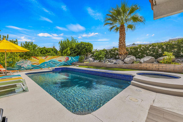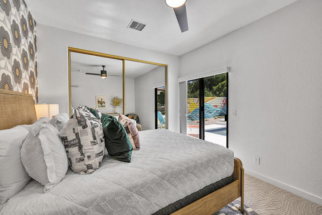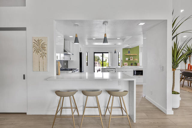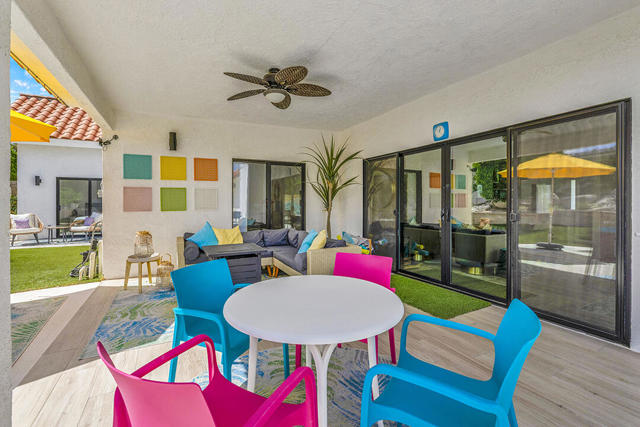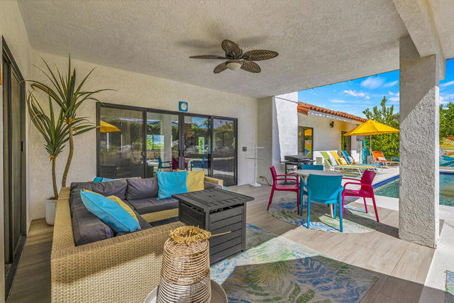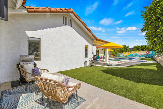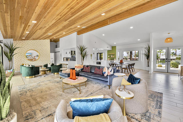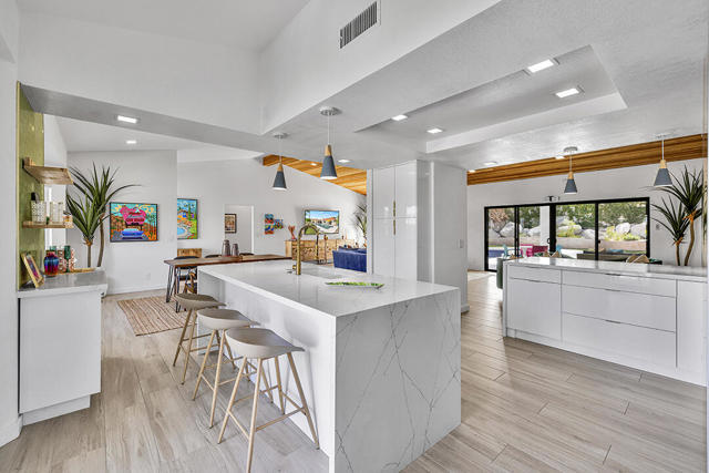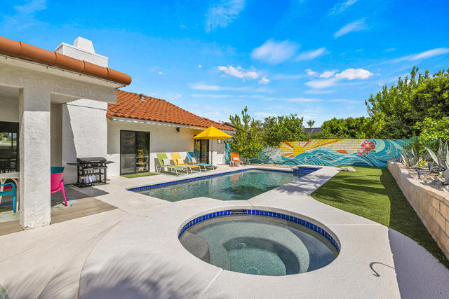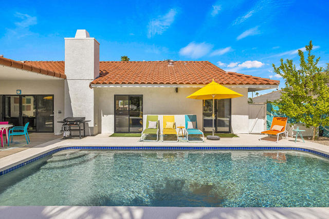 This fully furnished, professionally designed home in South Palm Desert offers modern style perfectly balanced for comfort with indoor-outdoor living. Extensively updated throughout, the open floor plan features vaulted ceilings, a spacious living room, a generous dining area, and a spectacularly renovated kitchen. Sliding doors from the living room open to a private backyard featuring lush landscaping, artificial turf, a beautiful hand-painted mural wall, and an immaculate saltwater pool with spa.Inside, entertaining is easy with the fully updated kitchen completed in 2023. Here you have quartz waterfall counters and striking tile backsplash, a dine-in prep island, and a sitting counter at the separation to the living room. Other features include a bar area, pantry, updated stainless steel appliance package, and sliding door access to the front patio.The expansive primary suite offers sliding doors to the backyard pool area and a spa-inspired bathroom with access to the large walk-in closet. Two additional bedrooms are located in the main house: one with backyard access near the full guest bath and a front bedroom with an ensuite bath. The fourth bedroom is part of a private attached guest house, complete with its own bathroom, full kitchen, and sitting and dining areas. This space has backyard access with separate patio, a dedicated washer and dryer, and dual ductless mini-split A/C systems, providing privacy for guests or the possibility for rental, or caretaker's quarters.Just minutes from El Paseo's premier shopping and dining, along with being sold furnished, this home is ready for you to purchase and enjoy immediately.