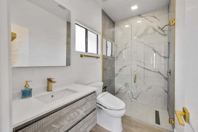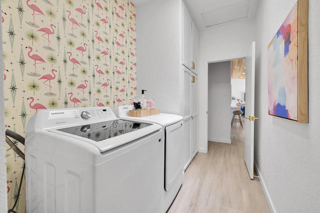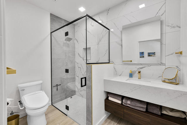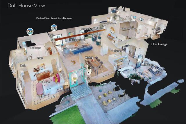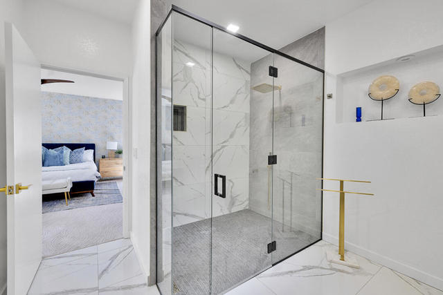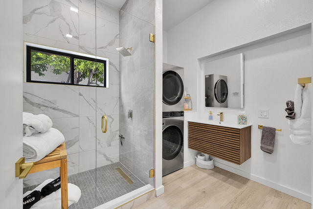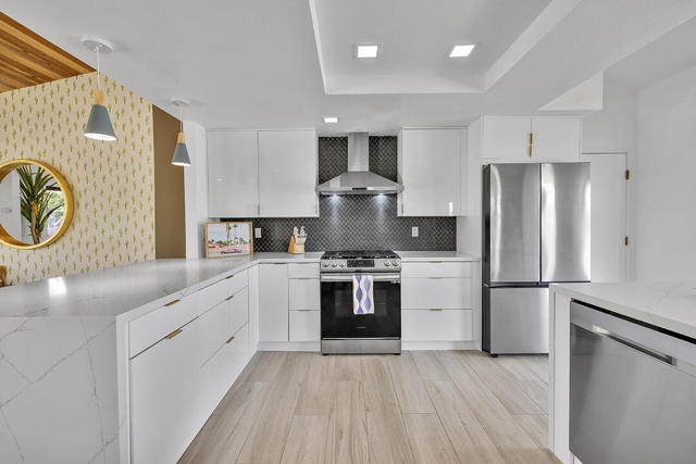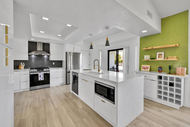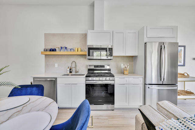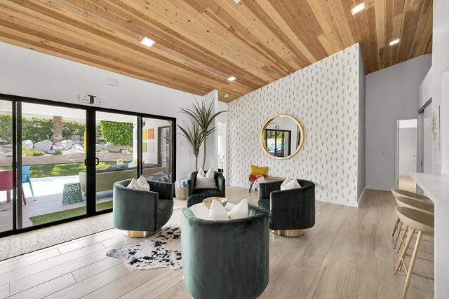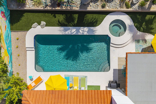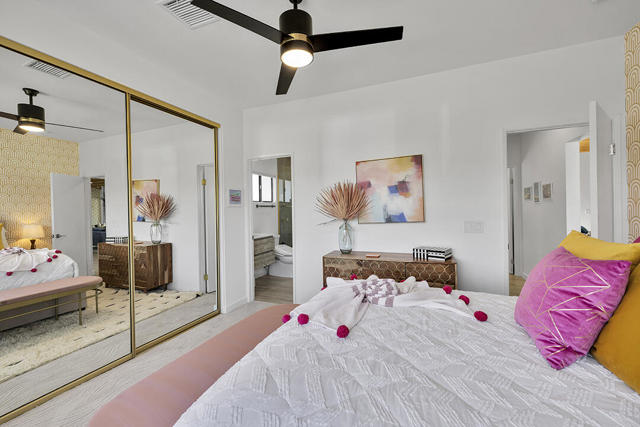 This fully furnished, professionally designed home in South Palm Desert offers modern style perfectly balanced for comfort with indoor-outdoor living. Extensively updated throughout, the open floor plan features vaulted ceilings, a spacious living room, a generous dining area, and a spectacularly renovated kitchen. Sliding doors from the living room open to a private backyard featuring lush landscaping, artificial turf, a beautiful hand-painted mural wall, and an immaculate saltwater pool with spa.Inside, entertaining is easy with the fully updated kitchen completed in 2023. Here you have quartz waterfall counters and striking tile backsplash, a dine-in prep island, and a sitting counter at the separation to the living room. Other features include a bar area, pantry, updated stainless steel appliance package, and sliding door access to the front patio.The expansive primary suite offers sliding doors to the backyard pool area and a spa-inspired bathroom with access to the large walk-in closet. Two additional bedrooms are located in the main house: one with backyard access near the full guest bath and a front bedroom with an ensuite bath. The fourth bedroom is part of a private attached guest house, complete with its own bathroom, full kitchen, and sitting and dining areas. This space has backyard access with separate patio, a dedicated washer and dryer, and dual ductless mini-split A/C systems, providing privacy for guests or the possibility for rental, or caretaker's quarters.Just minutes from El Paseo's premier shopping and dining, along with being sold furnished, this home is ready for you to purchase and enjoy immediately.