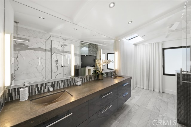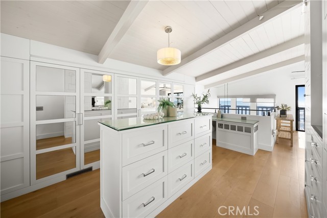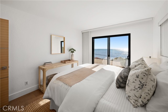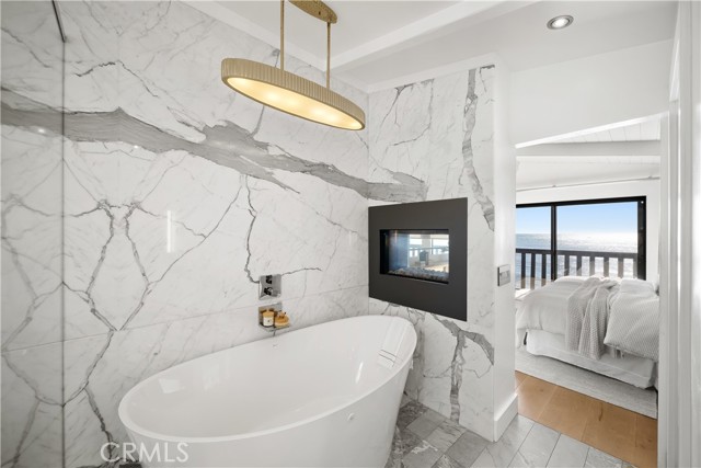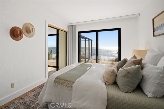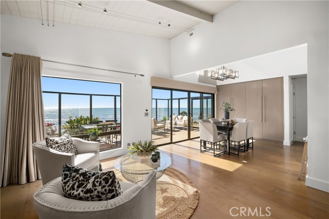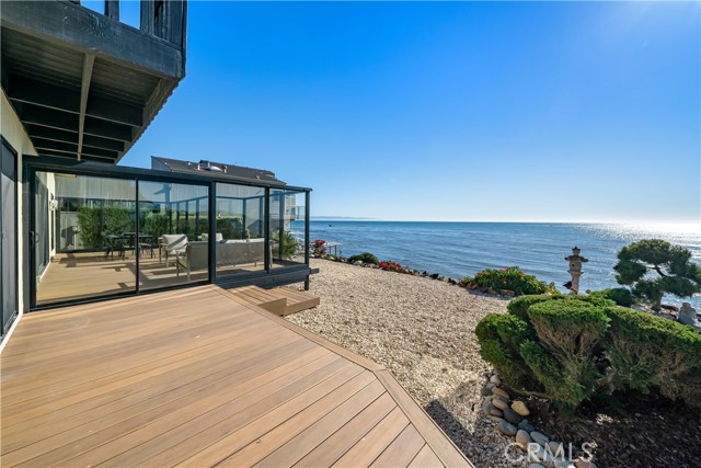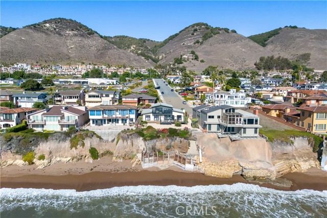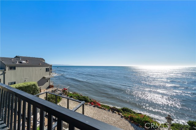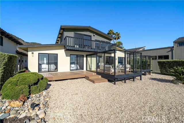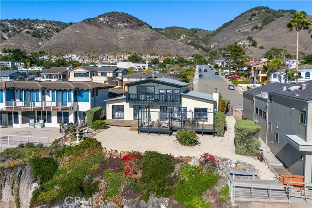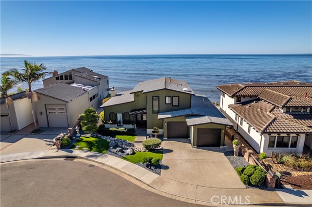 Perched dramatically above the Pacific along Shell Beach’s coveted Shoreline Drive, this Contemporary Coastal retreat captures panoramic ocean views from every room. Thoughtfully redesigned with an emphasis on natural light, clean architectural lines, and seamless indoor-outdoor flow, this residence perfectly balances refined sophistication with relaxed seaside living. The open-concept main level welcomes you with vaulted beamed ceilings and wide-planked flooring that carries throughout the space. Walls of glass frame endless blue horizons and open to a glass-enclosed deck designed for entertaining, dining al fresco, or simply soaking in breathtaking sunsets over the Pacific. The great room centers around a sleek linear fireplace and flows effortlessly into the dining area and gourmet kitchen, where custom cabinetry, a sea-glass mosaic backsplash, and dramatic natural stone countertops reflect the ocean’s hues. Stainless steel appliances, modern lighting, and a stylish breakfast bar complete this elevated culinary space. Upstairs, the primary suite offers a serene private escape with vaulted tongue-and-groove ceilings, a contemporary see-thru fireplace, and sliding glass doors leading to a private balcony overlooking the coastline. The spa-inspired ensuite bath features radiant floor heating, marble and glass finishes, dual vanities, and a large walk-in shower that evokes a luxurious retreat. A custom dressing area with built-ins and mirrored cabinetry provides abundant storage and elegance. Two additional bedrooms on the lower level open directly to the backyard, each featuring sliding glass doors that invite in sea breezes and uninterrupted ocean views. The guest bath is beautifully appointed with sleek tilework, dual vanities, and a walk-in shower with a rainfall fixture. Outside, the blufftop yard offers a front-row seat to the ever-changing coastline. Low-maintenance landscaping, mature plantings, and multiple seating areas create a tranquil environment for relaxing or entertaining above the waves. Supported by its own seawall, the home provides peace of mind and enduring protection from coastal erosion—an invaluable asset on the bluffs. Located in one of Shell Beach’s most desirable enclaves—just moments from oceanfront dining, boutique shops, and coastal trails—this residence embodies the essence of Central Coast living, where architecture and ocean converge in timeless harmony.