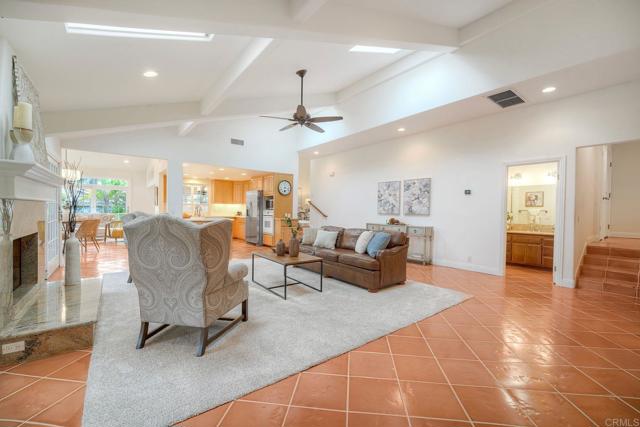 Proudly offered for the first time, this exceptional home reflects a legacy of loving ownership and thoughtful care. Filled with warmth and character, the residence is bathed in natural light from an abundance of windows, skylights, and sliding glass doors, creating a bright and uplifting atmosphere throughout. Rich terracotta flooring in the main living areas adds timeless elegance and a welcoming sense of style.The versatile floor plan is both unique and highly functional, featuring two primary bedrooms and multiple flexible living spaces. Upon entry, a primary suite is located to the right, while to the left is an office or bedroom with direct access to a bathroom that also opens to the hallway, ideal for guests. The living room flows gracefully down four steps into the family room, kitchen, and dining area, creating an inviting central hub for everyday living and entertaining. A sunroom, cherished by the sellers, offers a stunning wall of windows and beautiful light while overlooking the backyard, making it a perfect space for relaxing, reading, or gathering with friends. Beyond the family room, you’ll find a second primary bedroom complete with a cozy fireplace, along with an additional secondary bedroom. The sellers thoughtfully added a bonus room upstairs in the attic, ideal for a studio, playroom, or private office, as well as a walk-in storage room providing valuable extra space. The spacious laundry room includes ample cabinetry and convenient access to the garage. Outdoors, the property transforms into a private sanctuary. The covered patio invites year-round enjoyment, offering the cozy glow of a fireplace in winter and cool breezes on summer evenings. Mature landscaping fills the yard with birdsong and natural beauty. The sparkling pool features a generous shallow end designed for the whole family to comfortably enjoy. A tranquil pond with waterfall, garden areas, and grassy lawn complete this peaceful outdoor retreat. Located within close proximity to parks, shopping, dining, highly sought-after schools and a local favoritie, Bernardo Winery.This is a rare opportunity to own a home that blends timeless charm, flexible living spaces, and a resort-style backyard, all wrapped in a setting that has been lovingly maintained for over five decades. A truly special property ready to welcome its next chapter.