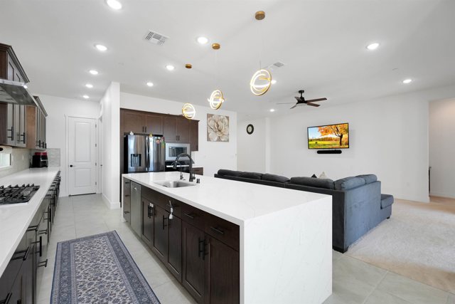Welcome to this immaculate, northeast-facing, modern single-story home in the highly desirable River Islands community of Lathrop, within the Banta Unified School District. Thoughtfully upgraded throughout, this home offers 3 beds, 2.5 baths and a versatile den ideal for a home office, flex space or optional 4th bedroom. The open-concept, light-filled layout showcases elegant tile flooring and a gourmet kitchen with sleek quartz countertops, stainless steel appliances and an oversized island perfect for everyday living and entertaining. Modern finishes, SMART home features and pre-paid solar add efficiency and convenience throughout the home. Step outside to professionally landscaped, low-maintenance front and rear yards designed for relaxation and outdoor enjoyment. Located in one of Lathrop’s most sought-after neighborhoods, residents enjoy access to top-rated schools, scenic trails, lakes, parks, and a vibrant community lifestyle. Move-in ready, energy-efficient, and beautifully maintained; this home delivers comfort, style, and location in one exceptional package. modern finishes throughout. Located in the highly sought-after River Islands community, residents enjoy top-rated schools, scenic trails, lakes, parks and a vibrant neighborhood lifestyle.