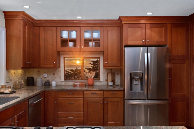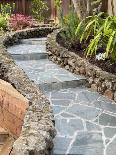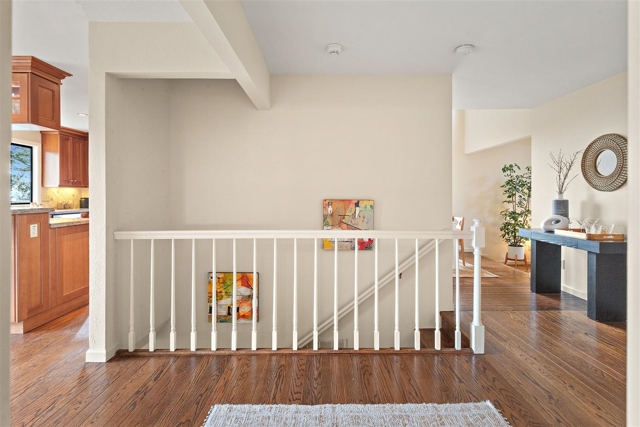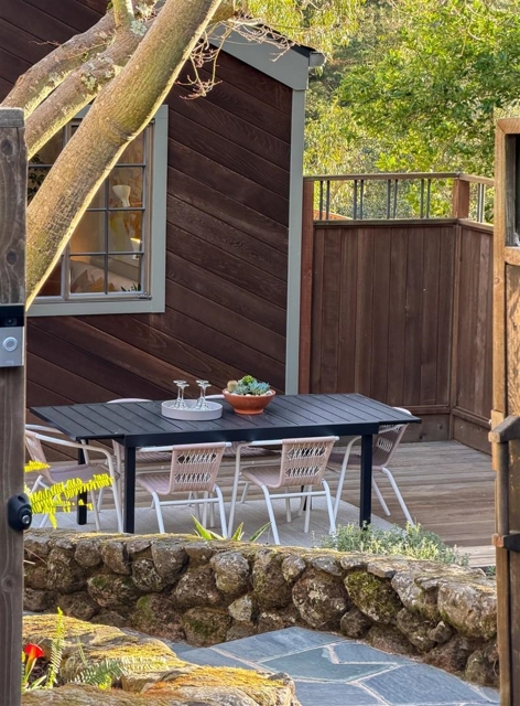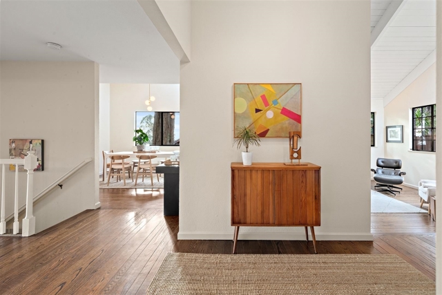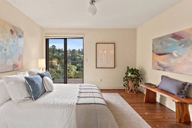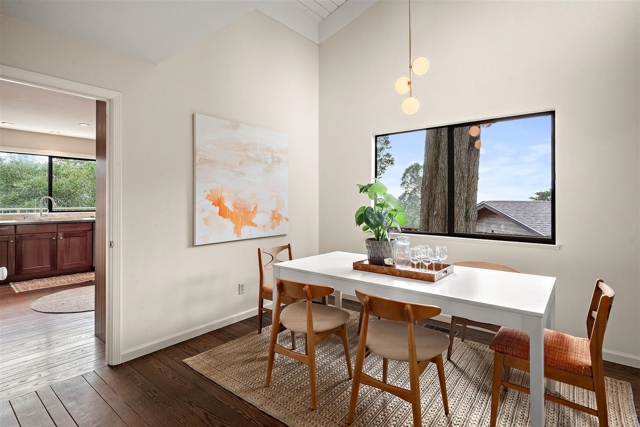 Beyond the front gate, a calm front garden unfolds with slate tiles, stone garden walls, and gently swaying perennials. Bay views rise just above the fenced garden, creating a peaceful space to relax and enjoy fresh air. This level-in, asymmetrical home welcomes you through double doors into a spacious entry with soaring wood-planked ceilings. The generous volume provides space for art and furnishings, while the living room is anchored by a gas-starter fireplace and windows overlooking the beautifully maintained garden. A formal dining room captures Bay views. The kitchen and den combine into an expansive great room that opens to a deck with canyon views and a western horizon outlook. The kitchen features stone countertops, ample storage, under-cabinet task lighting, and a thoughtfully placed window inset into the backsplash that frames the Bay. The main level includes a powder room and a generous primary suite with a walk-in closet and updated bath featuring an oversized shower with built-in bench seating. Downstairs are two bedrooms, a full bath, a dedicated laundry room, and flexible office space. The owner shared that this home provided a deep sense of grounding and loved the flow. She enjoyed the nearby Skyline entrance to Redwood Regional Park as part of her everyday.