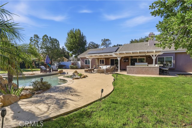 Situated on a quiet cul-de-sac in one of Chatsworth’s most desirable locations, this beautifully maintained 4-bedroom, 3-bath residence offers 2,404 square feet of comfortable living on an expansive 17,000-square-foot lot with breathtaking views of the Santa Susana Mountains. The inviting floor plan features a formal living room and formal dining room, along with a spacious family room highlighted by a wood-plank ceiling and cozy fireplace. The updated kitchen is ideal for both everyday living and entertaining, showcasing granite countertops, stainless steel appliances, a center island, and seamless flow into the family room. The primary suite is a private retreat with a walk-in closet and an en-suite bathroom. Three additional bedrooms and two full baths provide ample space for family, guests, or a home office. Step outside to a true resort-style backyard, designed for entertaining and relaxation. Enjoy a beach-entry pool and spa with waterfall, outdoor kitchen, covered patio, and generous grassy areas, all set against stunning mountain views. Additional highlights include copper plumbing, tankless water heater, recessed lighting, hardwood floors, plantation shutters, electric vehicle charger, Leased Solar Panels, three-car garage, and RV access. Conveniently located with easy access to 118 freeway, scenic hiking and walking trails, parks, dining, and shopping, this exceptional home offers the perfect blend of privacy, comfort, and lifestyle in one of Chatsworth’s premier neighborhoods.