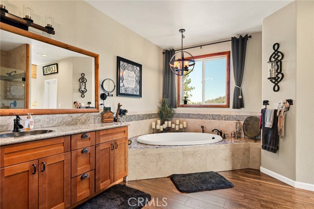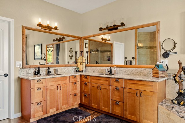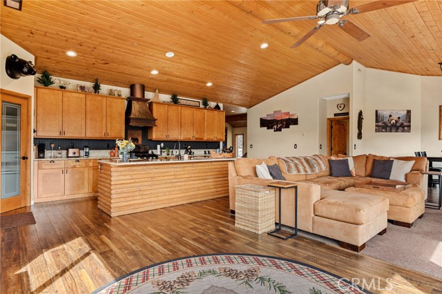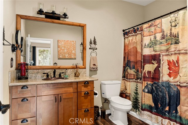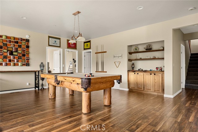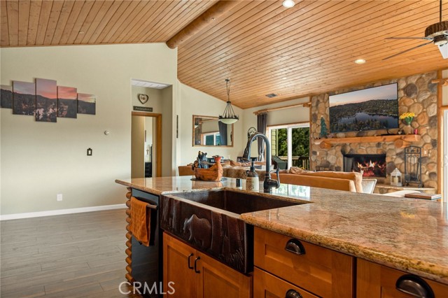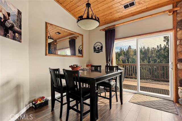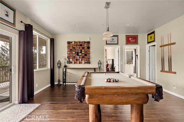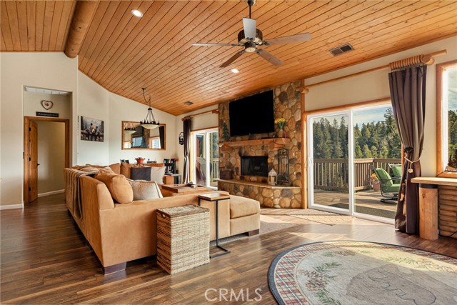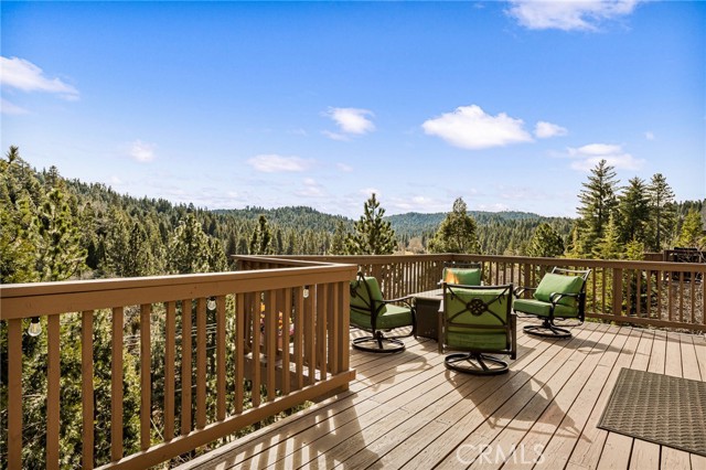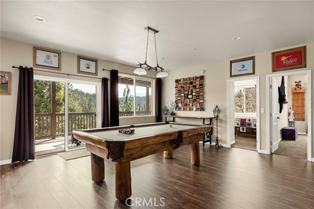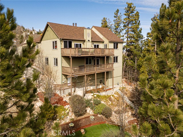 The Timberview Lodge. Tucked among the pines on a generous 14,000 sq ft lot, this is the kind of mountain home people imagine when they picture Lake Arrowhead with Lake Rights. This is a true mountain home — rich in character, thoughtfully designed, and built to feel just as right ten years from now as it does today. Step inside and you’re immediately welcomed by hardwood floors, natural textures, and sunlight pouring through expansive windows that frame the forest beyond. The kitchen blends rustic warmth with modern convenience, featuring granite countertops, custom cabinetry, stainless steel appliances, and a walk-in pantry. The open connection to the living and dining areas makes gathering easy and natural. Step outside to enjoy multiple outdoor spaces spread across the beautifully terraced lot. The oversized upper deck extends the main living area and provides a peaceful setting for morning coffee overlooking the trees. Below, usable yard space and layered landscaping create flexibility rarely found in this location. The primary suite is a true retreat, tucked away with vaulted wood ceilings and large picture windows that capture peaceful treetop views. The ensuite bath offers dual vanities with granite countertops, a soaking tub surrounded by natural light, and a walk-in glass shower with pebble stone flooring — spa-like comforts seamlessly woven into a timeless mountain aesthetic. Guest bedrooms are warm and inviting, ideal for hosting friends and family. One bedroom is perfectly suited for bunk beds and mountain-themed gatherings — a space where memories are made during long weekends and holidays. The expansive game room is a standout feature, designed for relaxed mountain evenings and entertaining on every level. With space for a pool table, lounge seating, and sliding doors that open directly to the deck, this level becomes its own entertainment retreat. Whether it’s game night, movie night, or simply enjoying fresh mountain air after sunset. Custom built-ins and hardwood flooring complete the room with style and function. Throughout the home, the finishes feel intentional and enduring — nothing overly trendy, nothing that will feel dated in a few years. Just solid, warm, classic mountain design. With an oversized garage, level driveway for easier year-round access, and a lot size that offers true breathing room. Wake up to pine-scented air. End the evening by the fire or around the pool table with the people you love.