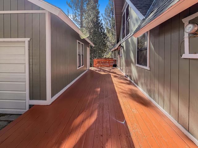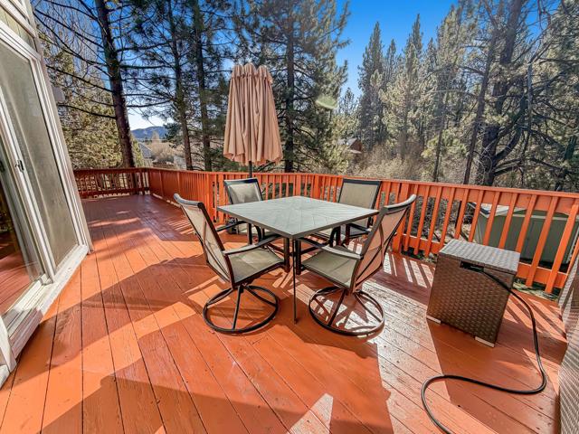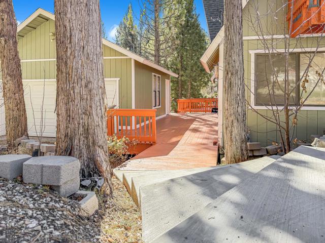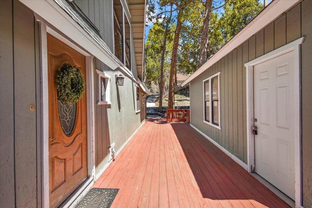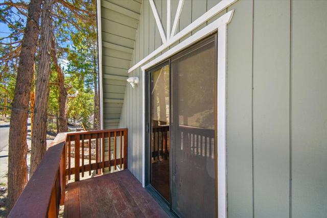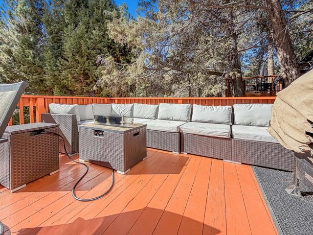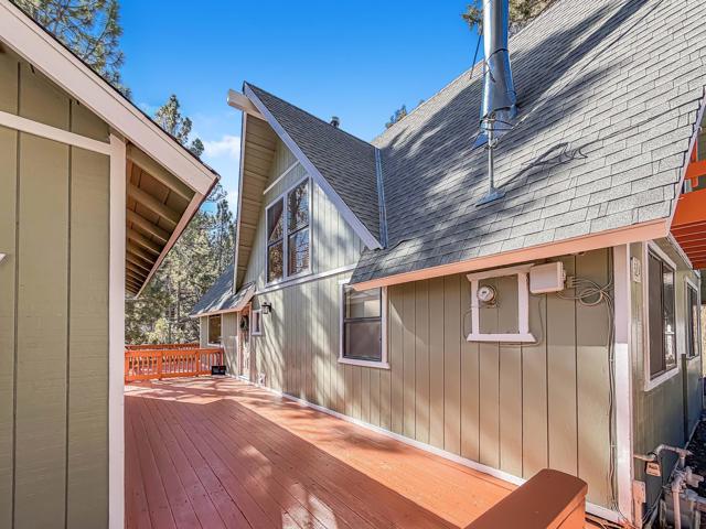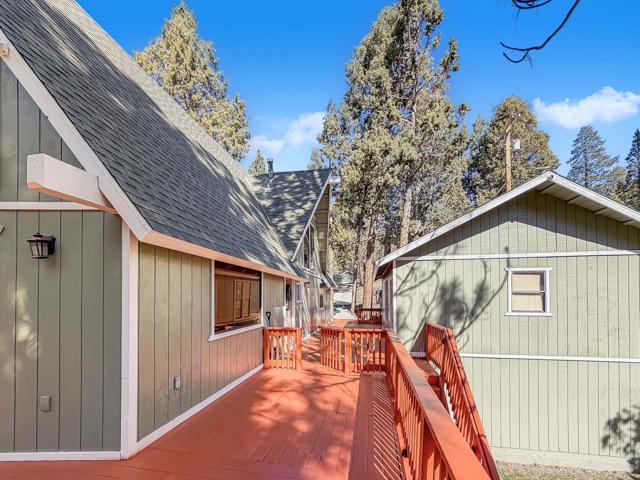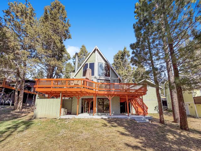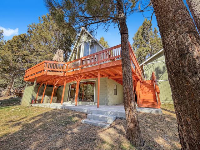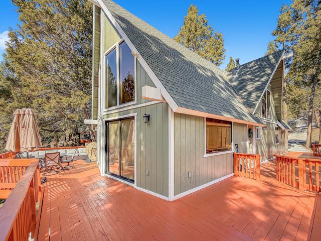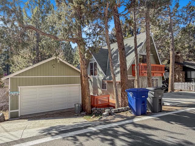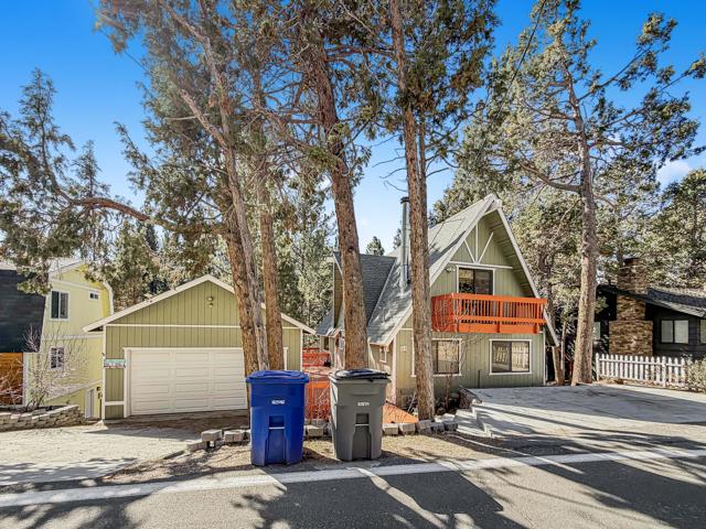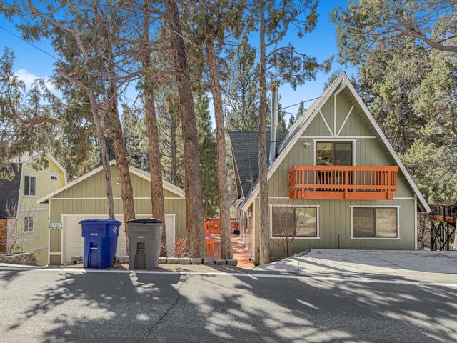 Discover your perfect investment or mountain getaway in Big Bear Lake with this stunning Fox Farm Chalet. Its prime location offers exceptional stargazing thanks to the high altitude and distance from city lights, making the night skies ideal for viewing constellations and meteor showers. This astounding home is a perfect fit for a short-term rental investment, a second home, or year-round living. Featuring 3 bedrooms, 3 bathrooms, and a versatile bonus room, the home boasts an eye-catching A-frame roof and abundant windows and sliding doors that flood the over 1,800 sq ft of living space with natural light. The uniquely designed, tri-level floor plan centers around the mid-level, the heart of the home. Here, a semi-open layout connects a sizable living room, complete with a cozy wood-burning fireplace, to a modern kitchen. The kitchen impresses with white cabinets, quartz countertops, a convenient island, stainless steel appliances, and distinctive lighting. This level also features two stylish bedrooms with lovely outdoor views and a full-size bathroom. Ascend to the top level for a private master bedroom retreat. This serene space includes its own cozy fireplace, exquisite outdoor views, and an extended loft area.The spiral staircase leads down from the mid-level to the ground floor, which is designed as an entertainment space and game room. This flexible area can be transformed into a man-cave, a children's den, an office workspace, or even set up as a fourth bedroom. A third full bathroom is also located on this level. Complementing these interior features is an incredible outdoor deck, perfect for seating and enjoying the mountain air.
