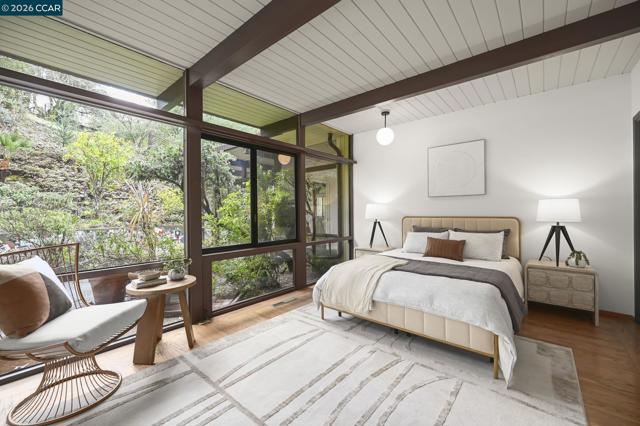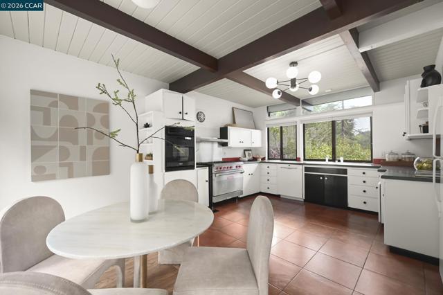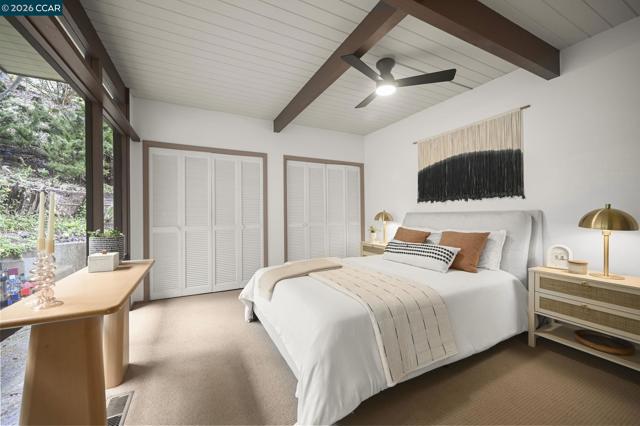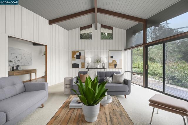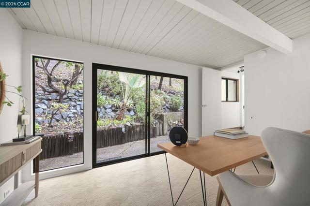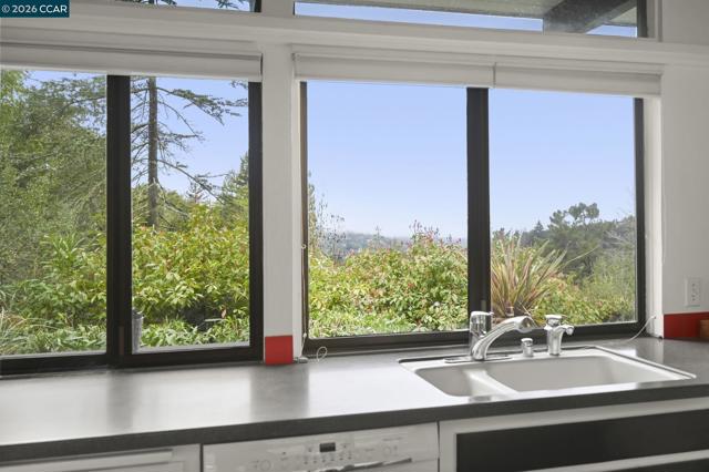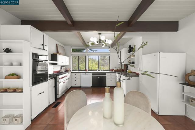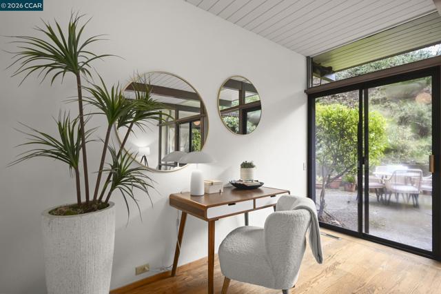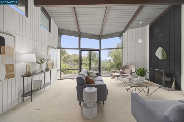 Welcome to 92 Evergreen Dr, a classic mid-century modern nestled in the hills of Orinda. Tucked up a semi-private drive, the home captures that iconic mid-century vibe from the moment you arrive. A formal living room & dining room showcase expansive picture windows framing incredible views of rolling hills & mature trees. The original yet beautifully maintained eat-in kitchen offers both charm & functionality, featuring a convenient pass-through to the dining room that makes entertaining effortless. A sliding glass door opens directly to the back patio, blending indoor comfort w/ outdoor living, perfect for morning coffee, summer barbecues, or relaxed evening gatherings. Down the hallway, you’ll find a hall bath & 2 spacious bedrooms, including the primary suite w/ an attached bath & bonus room/office. Built as a 3 bedroom, the owners took down a wall to create 1 large room – can easily go back to make it a 3 bedroom. Original mid-century charm shines, complemented by thoughtfully updated lighting that stays true to the home’s design. A wraparound deck offers the perfect place to soak in the views, while the secluded back patio surrounded by mature trees creates a peaceful, private retreat. A must see & ready for new owners to make it their own amazing mid-century masterpiece.