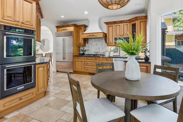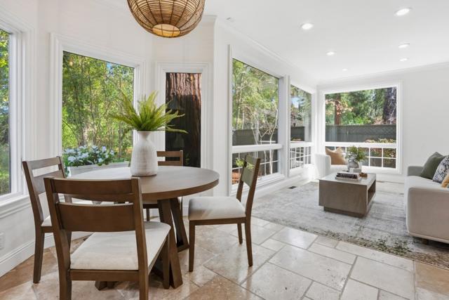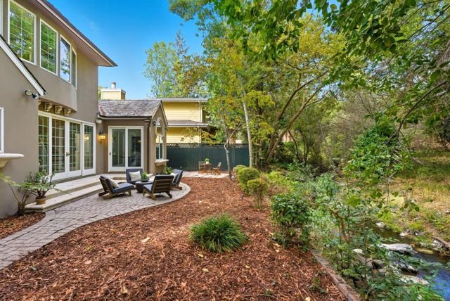 An Elegant Sanctuary to Call Home; Turn onto a cul-de-sac in the prestigious Golden Triangle of Saratoga and be transported from the hustle of Silicon Valley; with arches reminiscent of nearby Villa Montalvo throughout the home, this impressive Country English 4 bedroom home nestled near the end of the road welcomes you through a dramatic South facing front door into a sun-drenched living space; Be enchanted by looking through the 4 panel french doors that lead out to a stone patio and listen to the peaceful sounds of the Saratoga Creek; or grab a snack from your fully-appointed kitchen and relax in the all glass family room nook; all conveniently located less than a mile from the shops/dining of Saratoga Village and distinguished Saratoga schools. Newly refinished hardwood floors in living and 2 downstairs bedrooms with shared bath; two newly carpeted upstairs bedrooms with vaulted ceilings and en suite baths; primary bedroom with wrap around crown lighting, bay window and gas fireplace; impressive crown molding and tall baseboards; slate roof and copper gutters; freshly painted throughout; epicurean kitchen with Sub Zero fridge and Wolf range; Saratoga High, Redwood Middle, Saratoga Union Elementary Dist; easy access to hwys 9/17/85