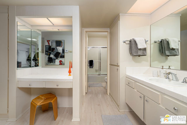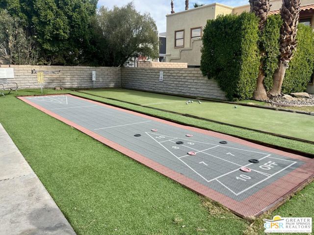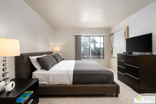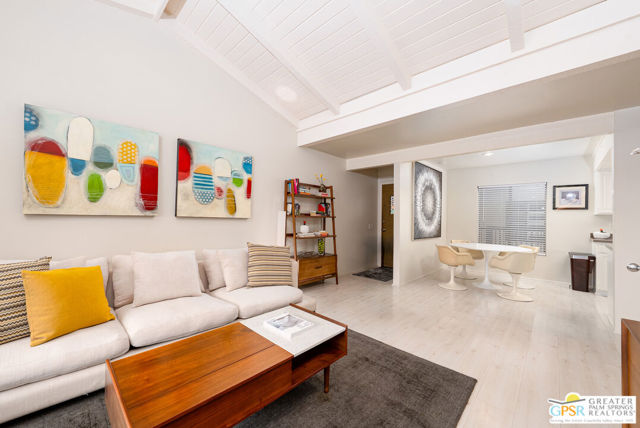 Need a small furnished Palm Springs place that doesn't break the bank and that ALLOWS short-term rentals? This welcoming 1 bedroom / 1 bath condo in the central Palm Springs gated community of Ranch Club Estados in offered TURNKEY FURNISHED! This upstairs condo is a perfect vacation get-a-way, work from home pied-a-terre or as an investment property. (Short-term rentals are allowed with a minimum of 15 days.) Light colored hardwood-like laminate flooring throughout provides a relaxing undertone. The tall beamed cathedral ceiling in the living room brings light and openness. The dual-pane living room sliders and bedroom window provide wonderful sound proofing to maximize interior comfort. Off the living room is a large, covered outdoor balcony with storage closet. The midcentury tulip dining table and chairs sit adjacent to the kitchen which includes gas cooking, oven, microwave, refrigerator, garbage disposal and window. The bedroom is large enough for the king bed, night stands and dresser while having ample walking space. Centrally located near downtown, the airport, shopping, and restaurants, this community offers resort-style amenities including beautifully landscaped grounds, three swimming pools and spas, tennis and pickleball courts, a fitness room, BBQ areas, shuffle board and bocce ball. The HOA allows short-term rentals (a minimum of 15 days) and long-term leases. HOA fees include Spectrum Cable TV, Internet, water, trash, and common area maintenance. Located on Fee Simple land that you own.
