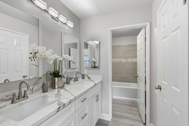 Exquisite in every detail, this natural light-filled end-unit was completely remodeled with exceptional craftsmanship, materials and designer finishes throughout. A rare offering that stands apart. A fully remodeled kitchen featuring custom cabinetry, beautiful stone countertops, and a striking designer tile backsplash that complements the elegant fireplace finish in adjacent living room, creating a cohesive, sophisticated aesthetic. Elegant plantation shutters, luxury vinyl plank flooring, and modern baseboards enhance the home's polished, contemporary appeal. Highly desirable downstairs bedroom can be used for guests/private office. Adjacent bath tastefully remodeled with oversize walk-in shower w/floor-to-ceiling designer tile, custom cabinetry and fixtures. Upstairs bath features a newer tub with an elegant tile surround. Attached 2 car garage, equipped with upgraded electrical capable of supporting EV charging. Situated in a quiet, well-maintained community offering a pool/spa/playground, the home combines comfort and the convenience of being located close to major commute routes, shopping, and other amenities. Perfect blend of luxury, functionality, & location.