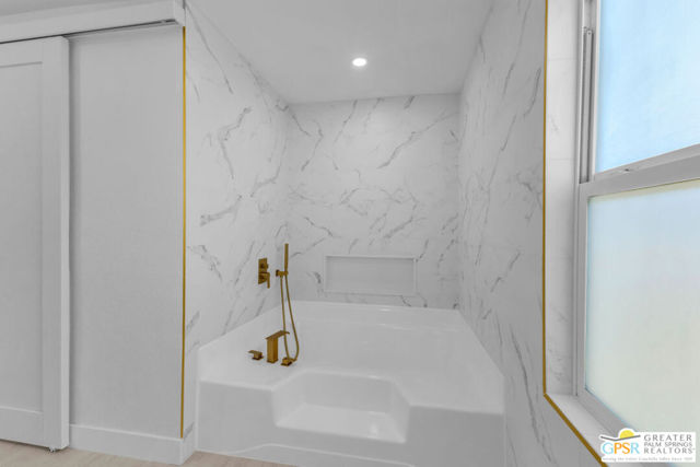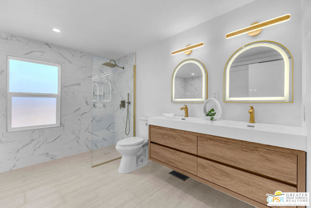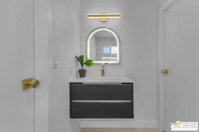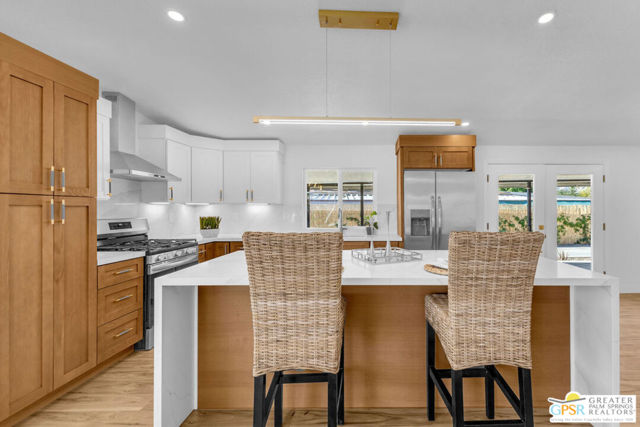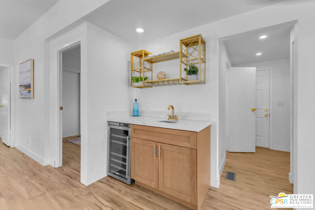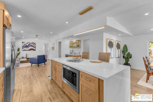 Rare oversized lot, mountain views, and a 2 car + golf cart garage with a separate bonus room and full bathroom make this beautifully remodeled desert retreat one of the most unique properties in 55+ Palm Desert Greens Country Club, where you own the land and golf is included in the low HOA. Inside, the 2 bedroom + bonus room, 3 bath home has been thoughtfully remodeled with a bright open layout and beautiful finishes throughout. The spacious kitchen features a focal point island with waterfall edges on both sides and opens into the living and dining areas. A stylish wet bar just across from the kitchen creates the perfect setup for entertaining. The primary suite offers a peaceful retreat with an updated bathroom featuring a soaking tub and a beautiful zero entry shower, while the guest bedroom and second bathroom provide comfort and privacy for visitors. The guest bath also features a sleek zero entry shower, adding both style and accessibility. Step outside and enjoy the incredibly expansive lot with beautiful mountain views and plenty of space to relax and enjoy the desert sunshine. One of the standout features of this property is the rare oversized 2 car + golf cart garage offering incredible versatility. In addition to ample parking and workspace, the garage includes a separate bonus room with bathroom, perfect for guests, a home office, hobby room, or creative studio. Palm Desert Greens Country Club is a vibrant gated community where residents enjoy an active desert lifestyle. Amenities include golf, clubhouse, fitness center, pools and spas, tennis courts, pickleball, and a variety of social activities throughout the year, creating a welcoming and engaging environment for homeowners. Properties offering this much space, flexibility, and garage capacity are rarely available anywhere at this price point. Schedule a private showing today.