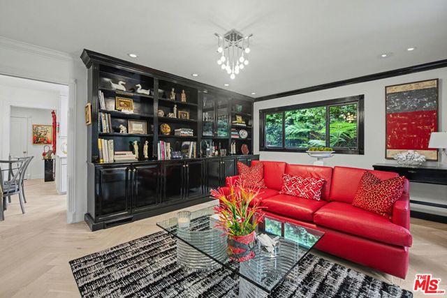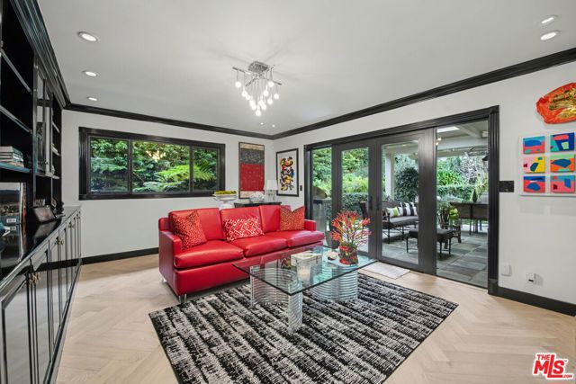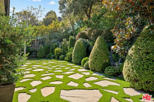 New look! New photos! New price! Please take note! Extensively and quite recently remodeled with exquisite taste and superior quality, this very special, light and bright one-story home harmoniously blends comfort and style and has been meticulously and painstakingly maintained. Its open and sensible floor plan begins at the formal foyer, leading to the sky-lit living room and dining area designed with the elegant entertainer in mind. This very expansive area, with its light-hued herringbone-patterned wood floors and two stone-clad fireplaces, opens easily to the backyard for seamless indoor-outdoor flow. The family room is warm and cozy with its wet bar and fireplace and opens to the fabulous outdoor living and dining room, complete with a barbecue area, outdoor fireplace and comfort heaters. The chef's kitchen has a breakfast area, quartz countertops, stainless steel appliances and double ovens. There are four bedrooms in total. The primary suite, also opening to the backyard, is truly wonderful with its generous closet space, many built-ins, beautiful spa-like bath and sitting area. Adjacent are two spacious bedrooms sharing a tasteful hall bath. The fourth bedroom is located by the kitchen, perfect as a gym, nanny's or housekeeper's room. The backyard is nothing short of glorious, every inch professionally landscaped. A true paradise, there is natural beauty to behold everywhere, all amidst the soothing sounds of an artfully-crafted cascading waterfall. There's also a separate multi-purpose art studio in the backyard, as well. Extensive updates, many of them quite recent, include central air and heat, metal doors and windows, many exquisitely-crafted built-ins, multiple skylights, recessed lighting, art-focused lighting, a separate generator connected also to the gas line, a Tesla car charging port, a new roof, a security system and so much more. The garage has extra storage and offers direct access into the house. Please ask the agents for a comprehensive list of updates. Inclusion in the very desirable public school districts which include Kenter Elementary School, Paul Revere Middle School and Palisades High School. All this, moments from the town center with all the shopping, dining and services that Brentwood offers.